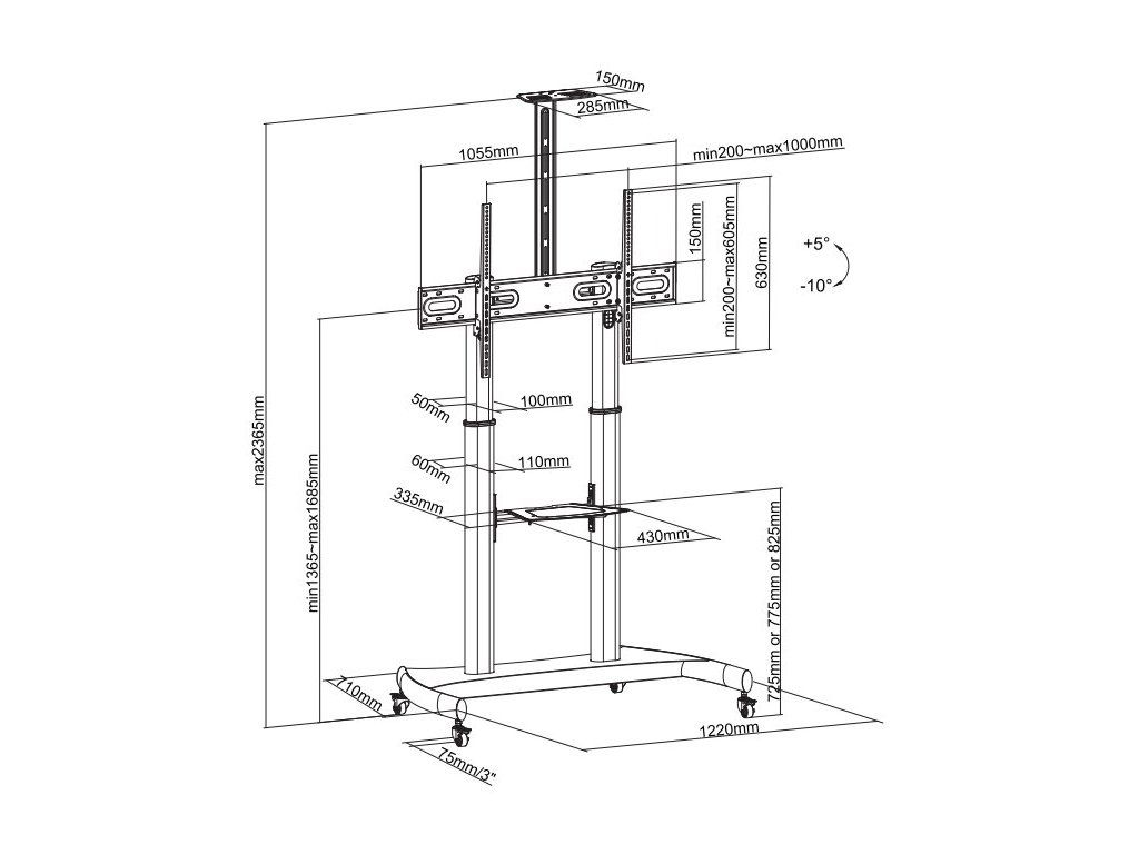 Neomounts PLASMA-M1950EPodlahový pojízdný stojan pro ploché obrazovky s úhlopříčkou od 60" do 100" a nosností až 100 kg. Držák je vhodný pro obrazovky, které odpovídají standardům VESA 200 × 200 až 1 000 × 600 mm. Navíc disponuje dvěma policemi pro příslušenství a kameru. Veškerý instalační materiál je součástí balení.