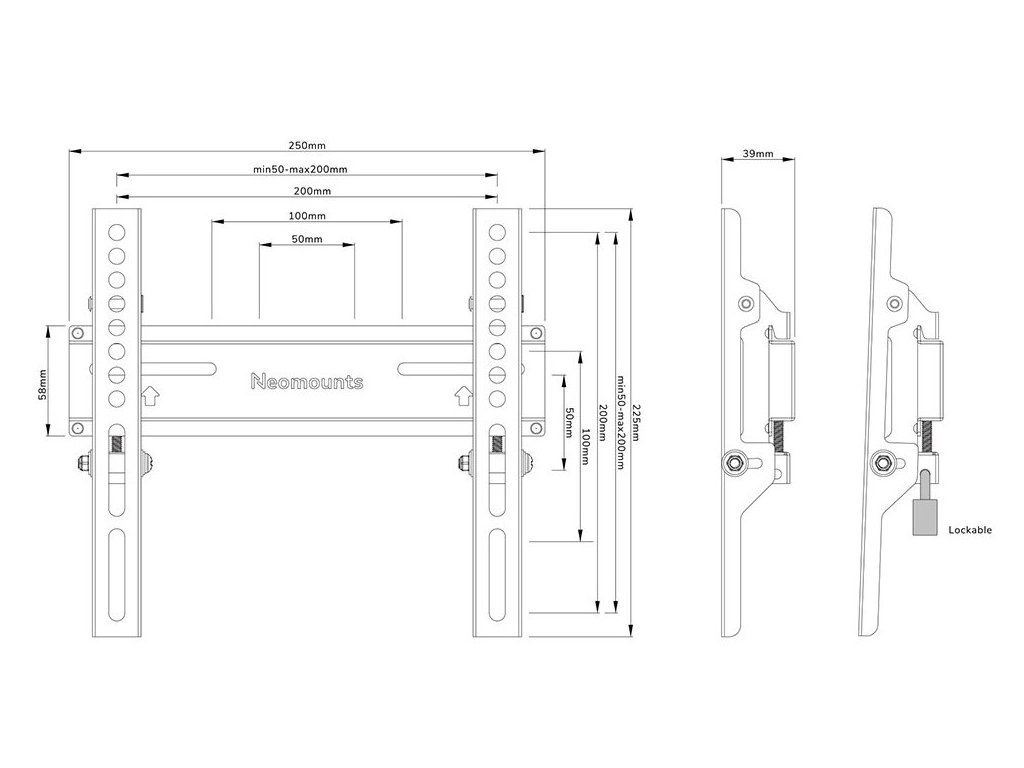 Neomounts WL30-350BL12Fixní nástěnný držák pro ploché obrazovky s úhlopříčkou od 24" do 55" a hmotností až 30 kg. Velkým benefitem je možnost uzamčení visacím zámkem (není součástí balení) z důvodu zamezení odcizení TV (ideální pro hotely, veřejné prostory). Držák má hloubku 3,9 cm a je vhodný pro obrazovky, které odpovídají standardům VESA 50 × 50 až 200 × 200 mm.