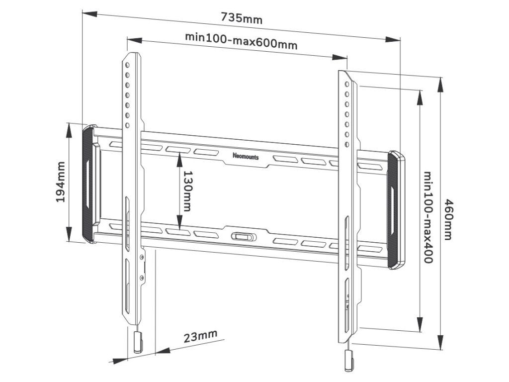 Rozměry VESA: 100 × 100, 100 × 150, 100 × 200, 120 × 120, 200 × 100, 200 × 200, 200 × 300, 200 × 400, 300 × 100, 300 × 200, 300 × 300, 350 × 350, 400 × 200, 400 × 300, 400 × 400, 440 × 400, 500 × 400, 600 × 200, 600 × 300, 600 × 400 mm