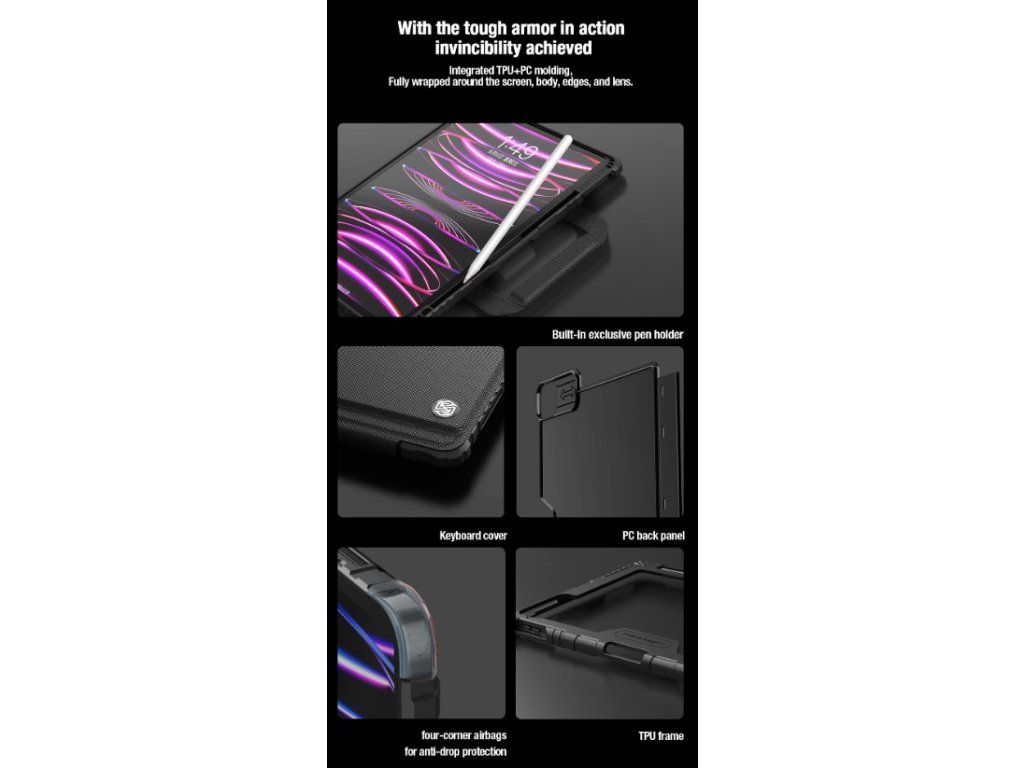 Nillkin Bumper Go Keyboard Case je víceúčelový ochranný kryt tabletu s odnímatelnou podsvícenou klávesnicí, slotem pro Apple Pencil a plynule nastavitelným úhlem tabletu. Chcete svůj tablet využívat jako mobilní kancelář, jako náhradu za těžký notebook, nebo vás prostě jen tablet baví? Tak přesně pro vás je zde víceúčelový ochranný kryt Nillkin. Kryt vám nabídne špičkově zpracovanou odnímatelnou bezdrátovou klávesnici s nízkým zdvihem, tichými a odolnými spínači a precizní profilací kláves pro to nejpohodlnější psaní. Klávesnice je také vybavena podsvícením, u kterého máte možnost si zvolit barvu a úroveň podsvícení. Na výběr je 7 různých barev a 4 úrovně podsvícení. V nepřetržitém provozu vám klávesnice vydrží až 55 hodin. Se zapnutým podsvícením se výdrž snižuje na 5 hodin. Na zadní straně naleznete praktickou opěrku pro tablet s plynulým nastavením úhlu. Na bocích se nachází praktické uši díky kterým je přenáší ještě snazší. Tablet lze opřít jak klasicky na šířku, tak i na výšku. Ať už pro práci s grafikou, psaní textů nebo čtení knih, vybere si prostě každý. Ochranný kryt se skládá z TPU + PU materiálu, který chrání váš tablet před poškozením. Navíc je opatřen zesílenými rohy a posuvným krytem fotoaparátu pro ještě větší ochranu. Vlastnosti - materiál: TPU + PU - ochranný kryt s vestavěnou odnímatelnou klávesnicí - přihrádka pro Apple Pencil - výdrž baterie v nepřetržitém provozu až 55h (Se zapnutým podsvícením až 5h) - plynulé nastavení úhlu tabletu - posuvný ochranný kryt fotoaparátu - zesílené rohy - možnost opření tabletu na výšku i šířku - praktické uši pro snadné přenášeníDodatočné parametre