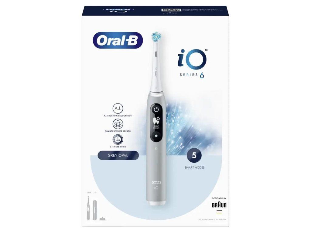 Oral-B iO Series 6 Grey Opal elektrický zubní kartáček, magnetický, 5 režimů, tlakový senzor, AI, pouzdro 4210201381686
