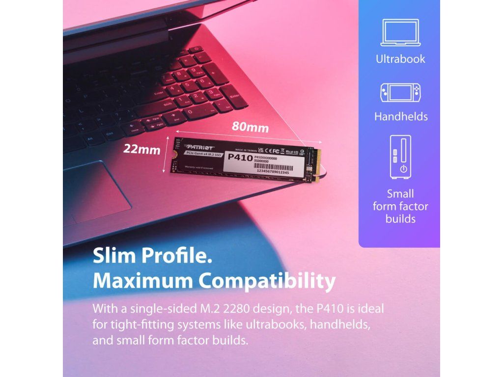 Design s vysoce účinným tenkým grafenovým chladičem je navržen s ohledem na efektivní chlazení a celkově optimální tepelný management. Technologie SmartECC se postará o ochranu a integritu dat. Mezi další přednosti patří nízká spotřeba energie a méně produkovaného tepla. Také díky tomu je SSD jednotka Patriot P410 ideálním úložiště pro notebooky, případně další přenosná a kompaktní zařízení. Disponuje úložištěm 1 TB a představuje tak kapacitu pro ukládání filmů, videí, her, pracovních projektů nebo multimédií.