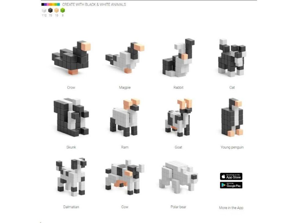 So stavebnicou môžete postaviť mnoho zvierat, ako je krava, mačka, medveď, tučniak, dalmatín a mnoho ďalších.