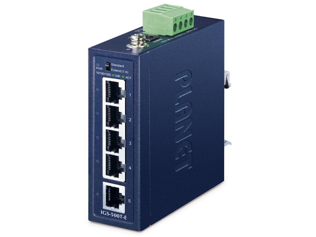 Planet IGS-500T-E, 5x 1000Base-T, DIN, IP40, rozšířený teplotní rozsah -40~75°C, ESD+EFT do 6kV, triple 12~55VDC, 250m IGS-500T-E