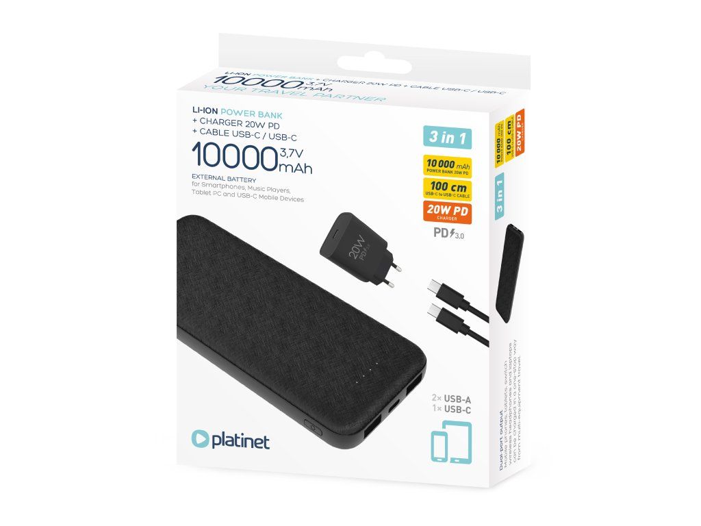 Platinet SET 3v1 Powerbanka 10000 mAh + Nabíjačka 20W Power Delivery, kábel USB-C 1m, čierna PLAPMPB10SETB