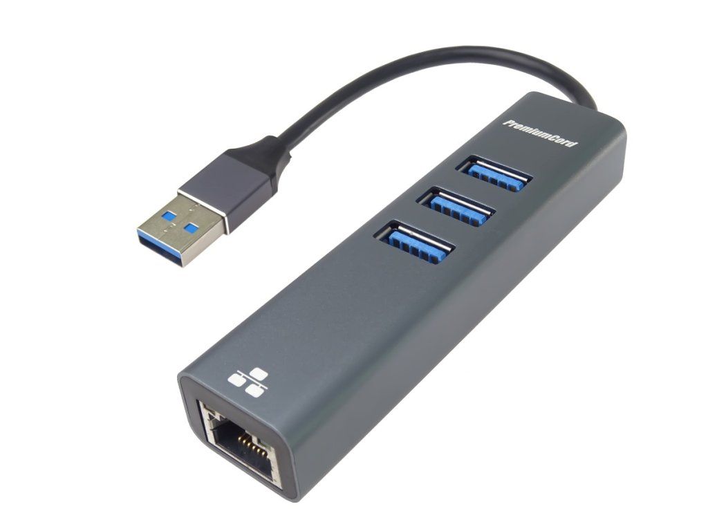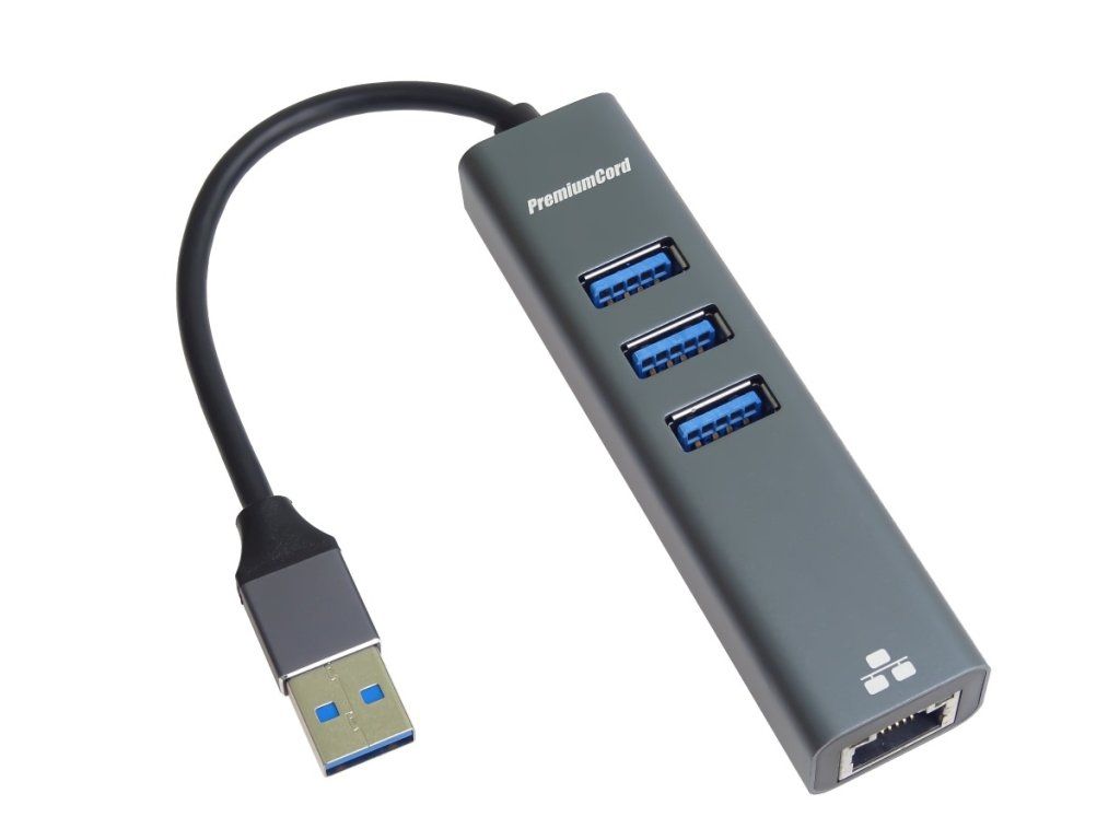 PremiumCord adaptér USB3.0 -> LAN RJ45 ETHERNET 10/100/1000 MBIT + 3x USB3.0 port Převodník, který umožní připojit Váš počítač s portem USB3.0 typu A do internetu nebo k lokální síti pomocí kabelu s RJ45 a navíc umožňuje zapojit tři USB3.0 periferie jako USB disk, tiskárnu, klávesnici a myš Adaptér je vhodný pro počítače, zpravidla notebooky, které nedisponují ethernetovým portem RJ45, či pokud se Vám rozbije port na základní desce, jako jeho snadná náhrada. *Podpora rychlostí 10/100/1000Mbps *3x USB3.0 umožňující zapojení tří periferií s rychlostí až 5 Gbps *Podpora kabelů na propojení Cat5 a Cat6 kategorií *Maximální rychlost USB3.0 Super speed 5 Gbps *Kovové pouzdro a kovový kryt konektoru *Nevyžaduje instalaci ovladačů *Chipset: RTL8153+GL3510 *Kovové hliníkové pouzdro adaptéru a konektoru *Barva: metalická *Délka: 15cmDodatočné parametre