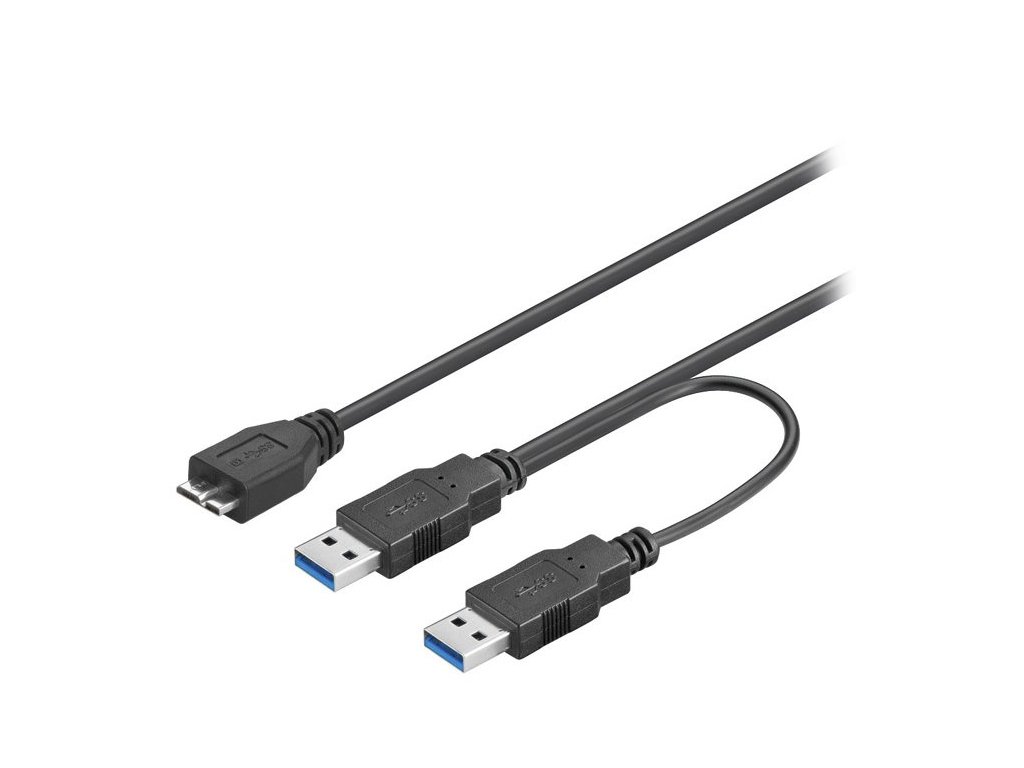 PremiumCord USB Micro B (M) na 2 x USB 3.0 A (M)Tento kabel je vhodný pro dvojité napájení externího 2,5" HDD nebo jiného zařízení vybaveného Micro USB B konektorem.