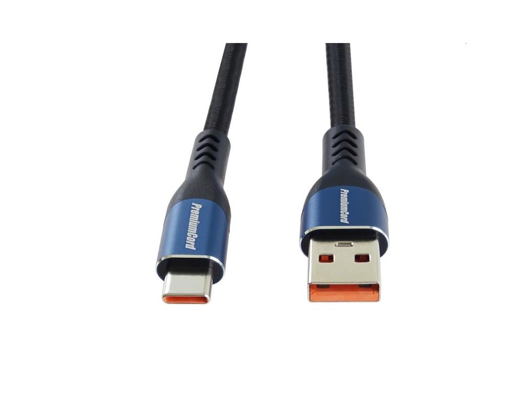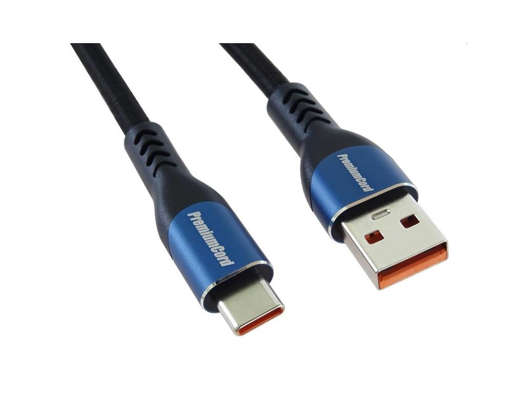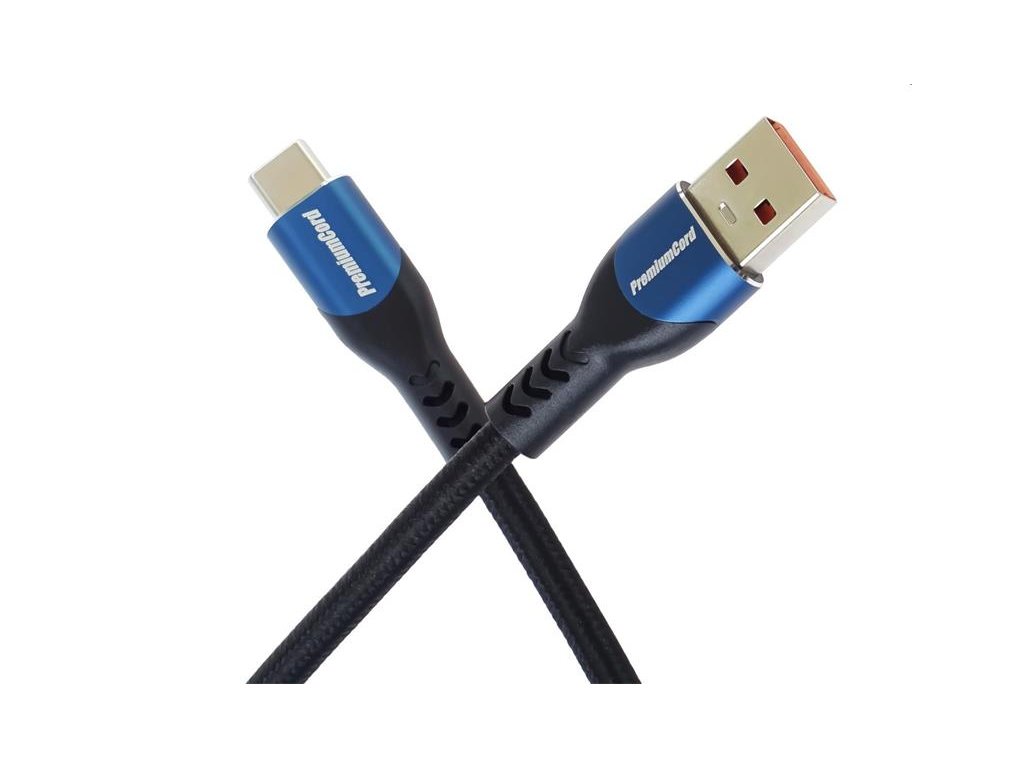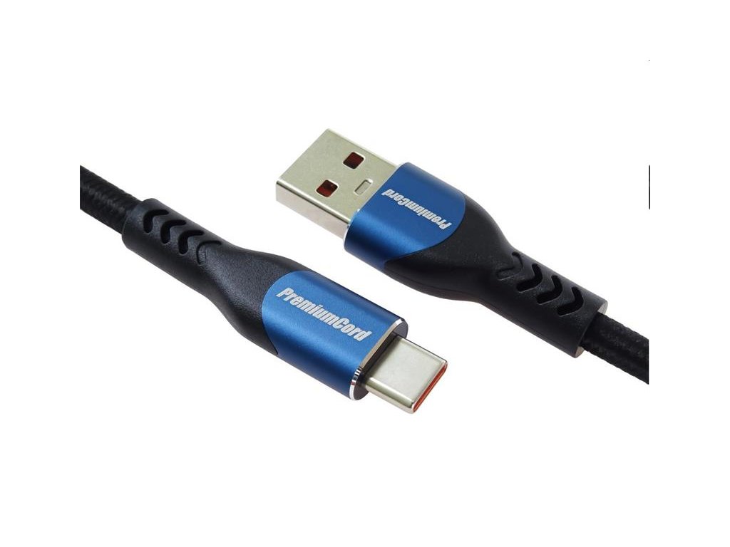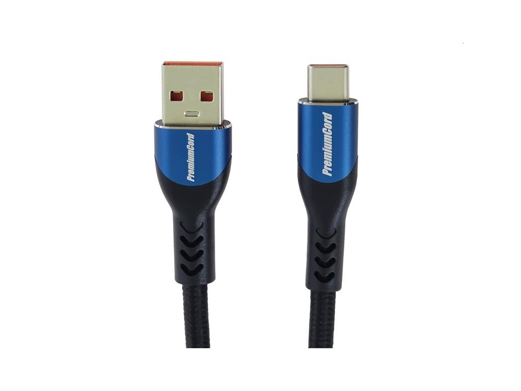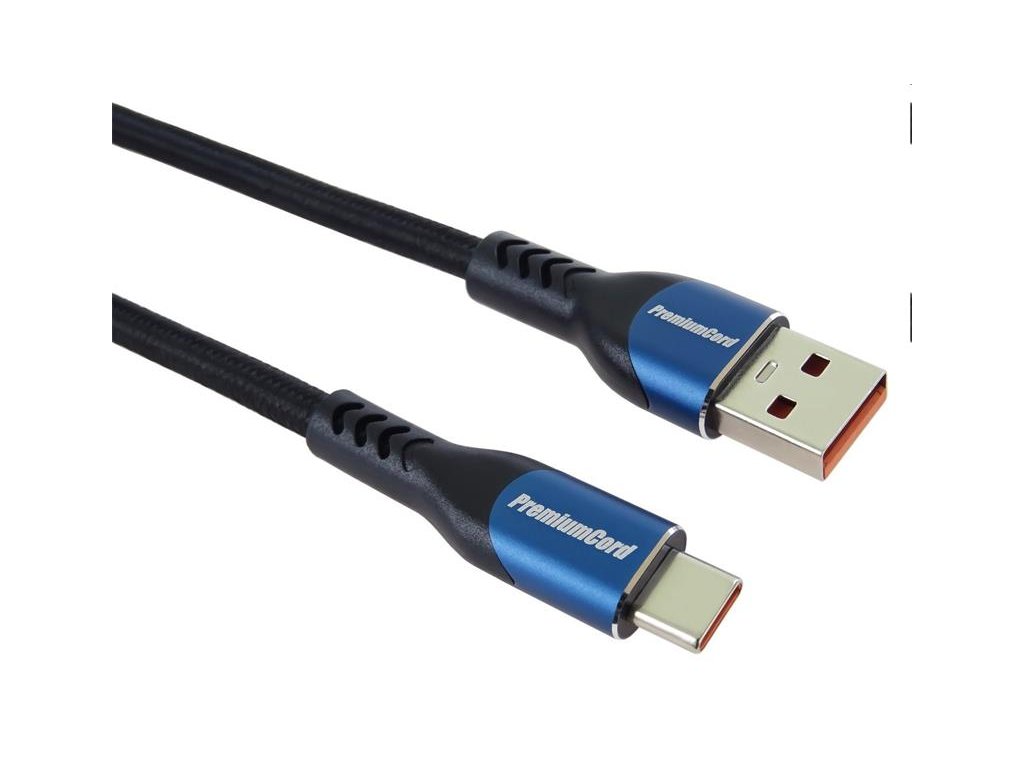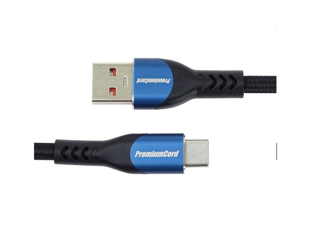 PremiumCord Super fast charging 5A kábel USB-C - USB 2.0 A bavlnený oplet a kovové hliníkové konektory 1 m - Prvý konektor: USB typ C samec - Druhý konektor: USB 2.0 typ A samec - Prenosová rýchlosť: High-speed 480Mbit/s rovnaká ako USB2.0 - Rýchle nabíjanie telefónov prúdom až 5A (pri teste s mobilným telefónom bolo dosiahnuté prúd až 5A) - Podporuje rýchlonabíjanie QC 2.0 / QC 3.0 / QC4+: Qualcomm Quick Charge - Zastreknuté konektory s kovovými hliníkovými krytkami, - USB konektor typ-C sa dá zasúvať obojstranne, v ľubovoľnej orientácii - Medený vnútorný vodič - Flexibilný kábel s príjemným bavlneným opletom čiernej farby - Kovové hliníkové krytky konektorov modrej farby s logom PremiumCord - Balenie: PVC sáčok s etiketou a EAN kódom - Dĺžka kábla: 1mDodatočné parametre
