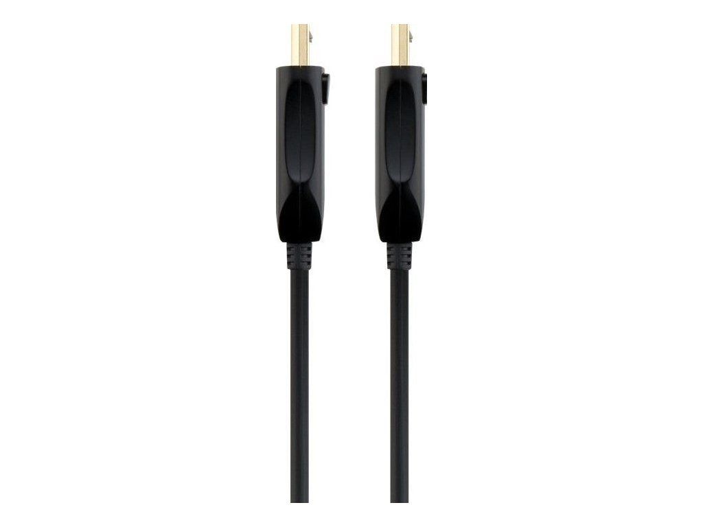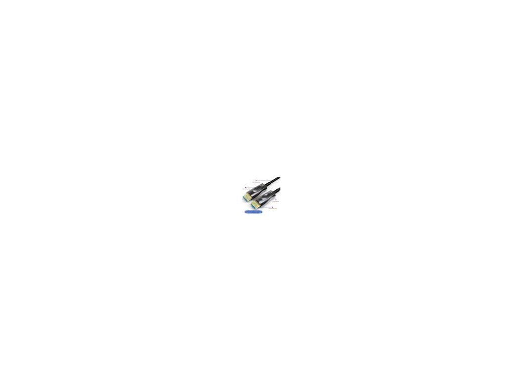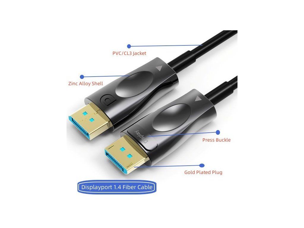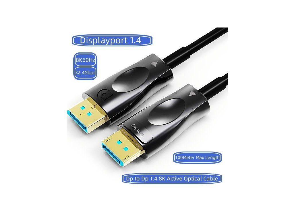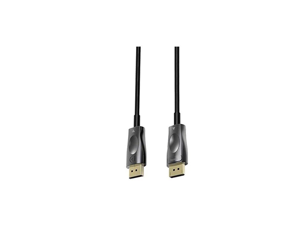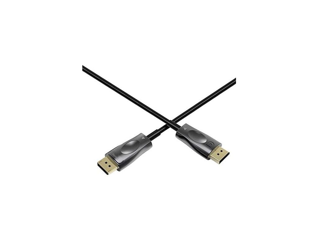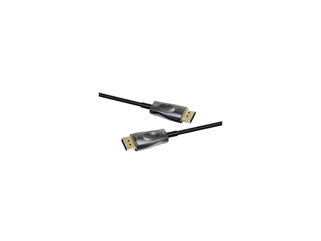 PremiumCord Optický DisplayPort 1.4 prípojný kábel M/M, pozlátené konekt. 15m Optický DisplayPort kábel slúži na spojenie dvoch audio/video zariadení cez moderné DisplayPort rozhranie, ako je napr. HD-DVD/BluRay prehrávač a LCD/Plazma televízor prenáša digitálny zvuk aj obraz a podporuje digitáciu ochranu obsahu HDCP. - Maximálne rozlíšenie: - FULL HD 1080p (1920x1080) pri 120Hz - 4K Ultra HD 2160p (3840×2160) pri 120Hz - 5K Ultra HD 2880p (5120x2880) pri 60Hz - 8K Ultra HD 4320p (7680x4320) pri 30Hz - Podporuje DisplayPort 1.4 štandard - Maximálny dátový prenos: 32.4 Gb/s - Pozlátené konektory: DisplayPort male <=> DisplayPort male - Podporuje HDCP2.2 - Kompletné napájanie so zbernicou DisplayPort, nepotrebuje externé napájanie - Okrúhly optický kábel (vnútorná štruktúra: optický kábel + metalické vodiče) - Hrúbka optického kábla 4.6mm - Ohybný optický kábel pre malý polomer ohybu (20 mm) - Optické vlákno: OM3 Multimode Fibre Optic - Pozlátené konektory - Konektory obsahujú poistku proti vytiahnutiu konektora - Farba kábla: čierna - Maximálna pracovná teplota: 50°C - Balenie v PVC sáčku s EAN kódom a popisom - Dĺžka kábla: 15 m Kábel obsahuje aktívnu elektroniku, ktorá funguje iba v jednom smere signálu. Kábel sa musí vždy zapojiť pri vypnutých zariadeniach a to iba v smere vyznačenom na kábli. Konektor označený "Source" sa vždy zapája do vysielacieho zariadenia (DVD, Blueray). Konektor označený "Display" sa vždy zapája do zobrazovacieho zariadenia (LCD, televízia, projektor).Dodatočné parametre