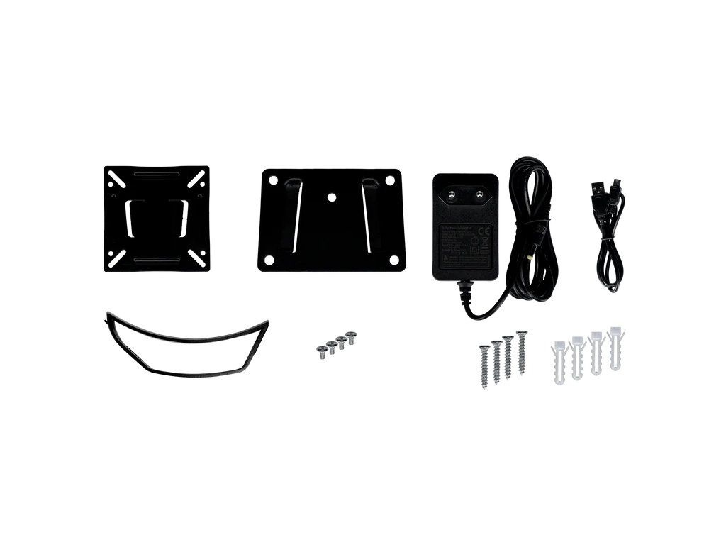 Součástí balení je napájecí adaptér, stojánek, mini USB kabel a sada pro montáž na stěnu.