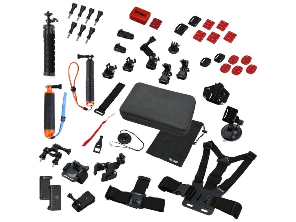 Univerzální 49dílná sada příslušenství Rollei ke kamerám Actioncam a GoPro určená pro outdoorové aktivity.