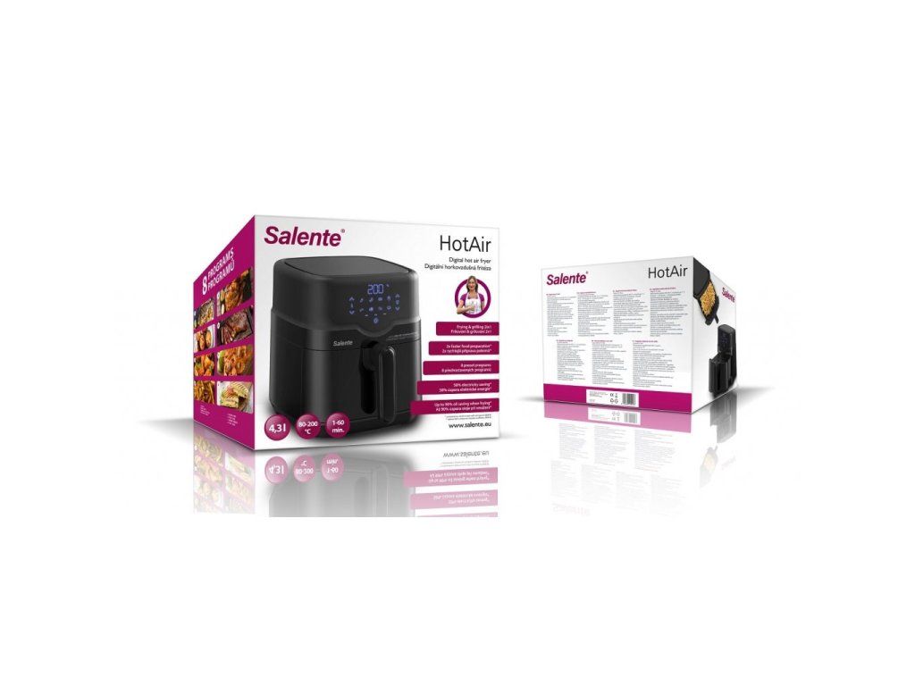 Horkovzdušná fritéra Salente HotAir spĺňa súčasné najvyššie nároky na zdravú a rýchlu prípravu jedál a ponúka kombináciu dvoch spôsobov prípravy - fritovanie aj grilovanie. Aj tým najnáročnejším kuchárom a kuchárkam umožňuje nastavenie teploty v rozsahu 80-200 °C v krokoch po 1 °C a nastavenie času prípravy jedla v rozsahu 1-60 minút v krokoch po 1 minúte.