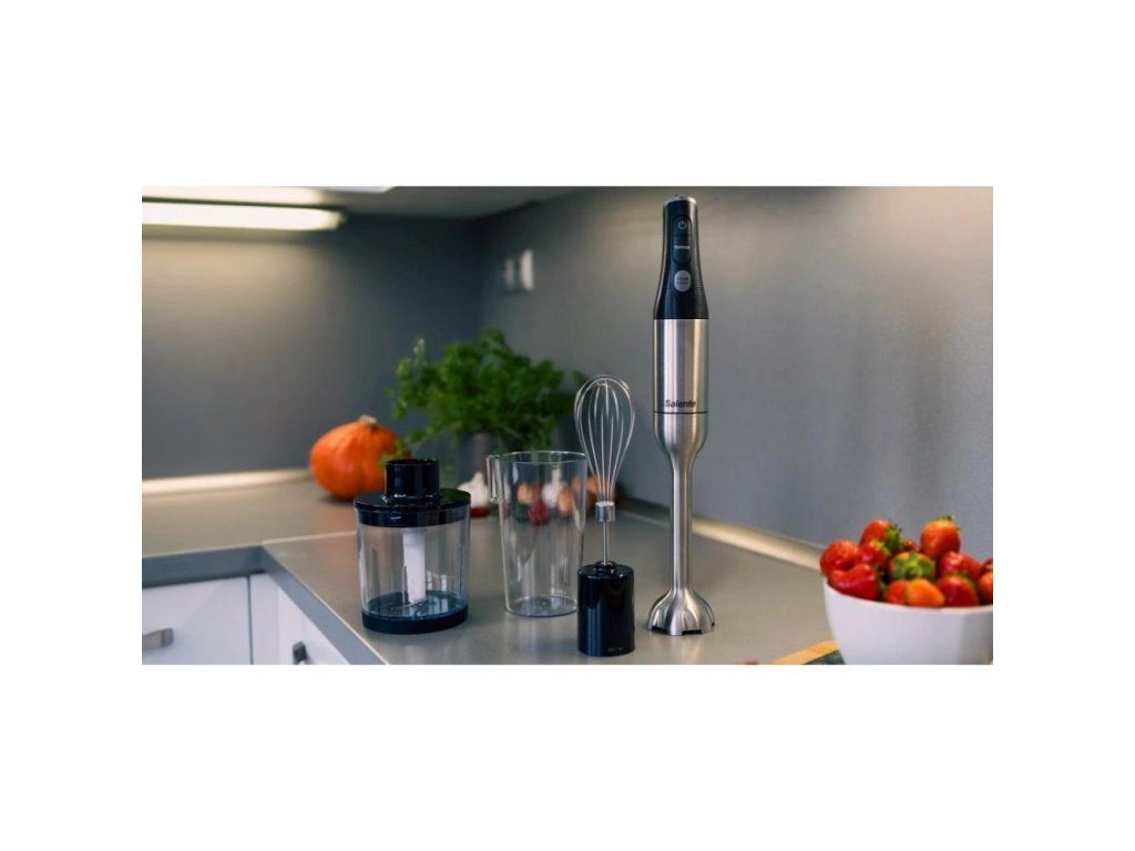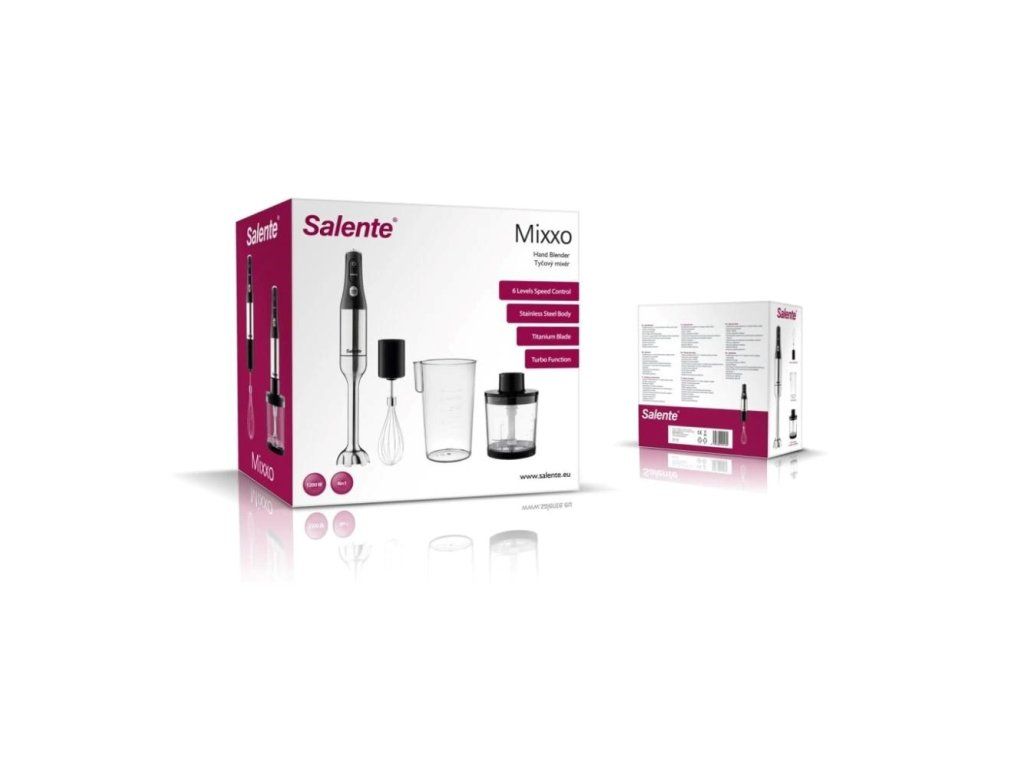 Salente Mixxo prichádza do vašej kuchyne aj s bohatým príslušenstvom: môžete využívať šľahaciu nadstavec s nerezovou metličkou, mixovaciu nádobu o objeme 600 ml (s odmerkami po 100 ml) a tiež sekáč s objemom 500 ml, ktorý je vybavený nerezovými sekacími nožmi a silikónovou protišmyšľovou podložkou. Zakúpením tohto všestranného mixéru jednoducho získate kompletné vybavenie, ktoré posunie vaše kulinárske čarovanie o úroveň vyššie.