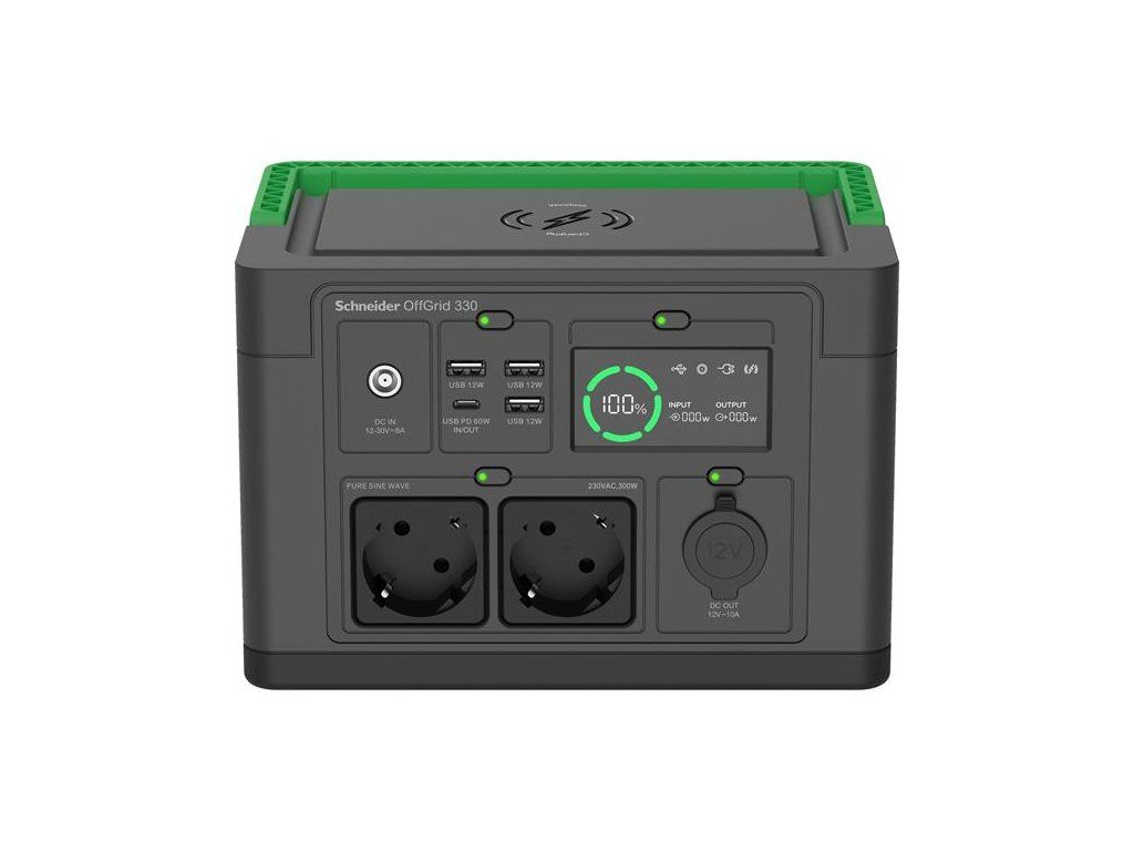 Prenosná nabijacia stanica Schneider OffGrid 330, 230 V, 332 Wh, lítium-iónová, LCD, 2 zásuvky CEE 7/3 Schuko, sínusová vlna, 3 USB-A, 1 USB-C, bezdrôtová nabíjačka.Základný popis: