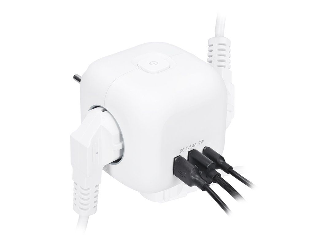 Kompaktný dizajn a jednoduché použitie Rozbočka v tvare kocky s dĺžkou strany 8 cm spája tri uzemnené zásuvky s detskou poistkou a USB nabíjačku s portmi USB-C a USB-A. Vďaka kompaktnému prevedeniu je ideálna na použitie v akomkoľvek interiéri. Podsvietený vypínač umožňuje jednoduché ovládanie všetkých zásuviek aj USB portov.