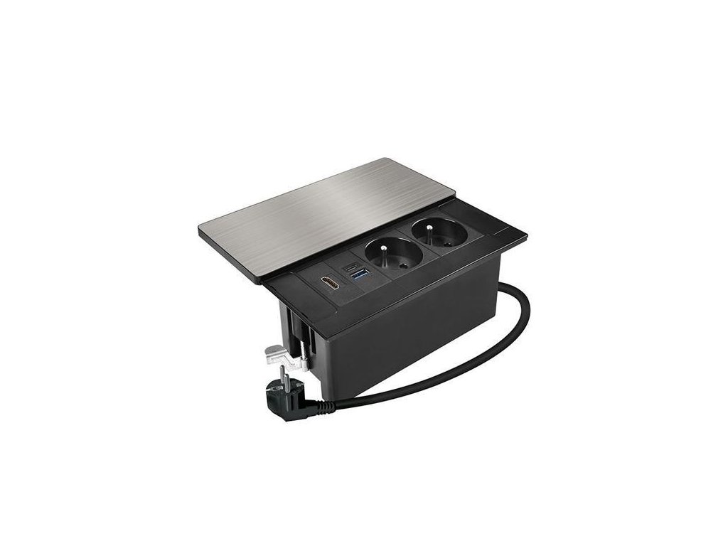 Tento vstavaný blok zásuviek ponúka viac než len napájanie – kombinuje dve sieťové zásuvky 230 V, USB rýchlonabíjačku a HDMI port v jednom kompaktnom module. Vrchný kryt z matnej tmavej nehrdzavejúcej ocele (inox) s posuvným mechanizmom sa ľahko začlení do moderného interiéru pracovných stolov, prezentačných priestorov aj obývacích izieb. Vďaka káblu dlhému 2 metre je inštalácia flexibilná a pohodlná.