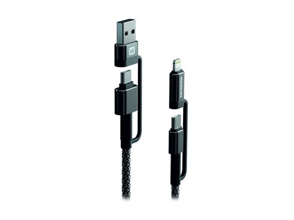 SWISSTEN KEVLAR 4 v 1 1,5 m; Opletený kabel vyztužený kevlarem nabízí extrémní odolnost proti zalomení a poškození. Umožňuje výměnu koncovek USB, USB-C a Lightning přesně podle vašich potřeb. Podporuje nabíjení výkonem až 60 W (3 A). ZÁKLADNÍ SPECIFIK...