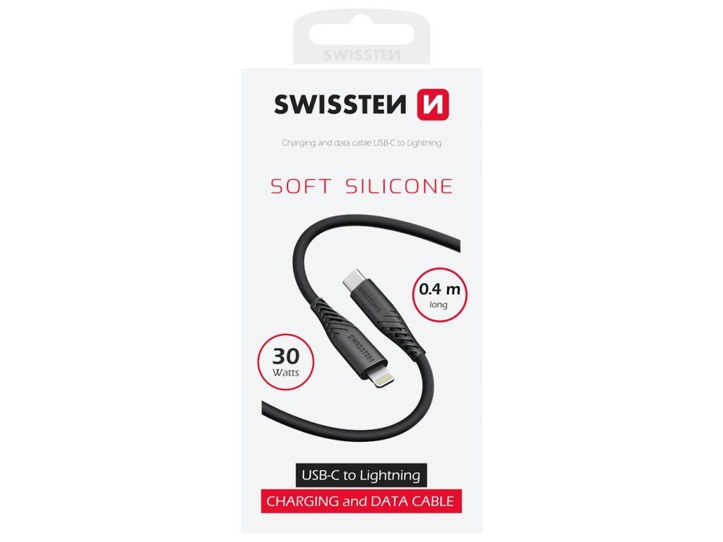 SWISSTEN SOFT SILICONE USB-C na Lightning 40 cm; Datový a nabíjecí USB-C na Lightning kabel podporuje kromě přenosu dat rychlostí 480 Mb/s také nabíjení proudem až 3 A a lze ho využít i pro technologii rychlého dobíjení s výkonem až 30 W . Kabel je vy...
