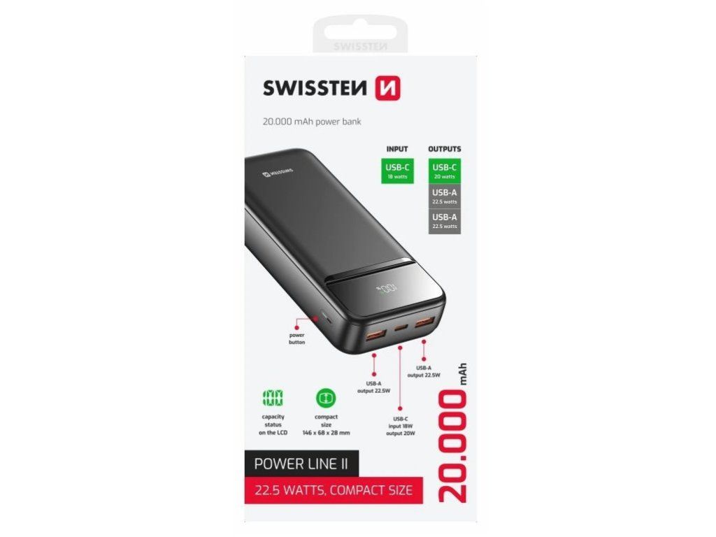 Powerbanka SWISSTEN POWER LINE II 20 000 mAh je spolehlivý zdroj energie pro vaše zařízení na cestách. Kompaktní a lehké provedení umožní snadné přenášení v tašce, batohu nebo v ruce. V rámci domova můžete nabíjet své zařízení třeba z postele, abyste pak nemuseli vstávat. Hlavní uplatnění však najde u milovníků cestování, dobrodružství a přírody. Vždy, když vyrazíte do kempu, na výlet do lesa nebo na víkendový festival, plně nabitá baterie se vždy hodí. Powerbanka SWISSTEN POWER LINE II disponuje kapacitou 20 000 mAh, která je dostatečná pro opakované nabití smartphonu, tabletu nebo drobné nositelné elektroniky – fitness náramku, sluchátek, chytrých hodinek apod.
