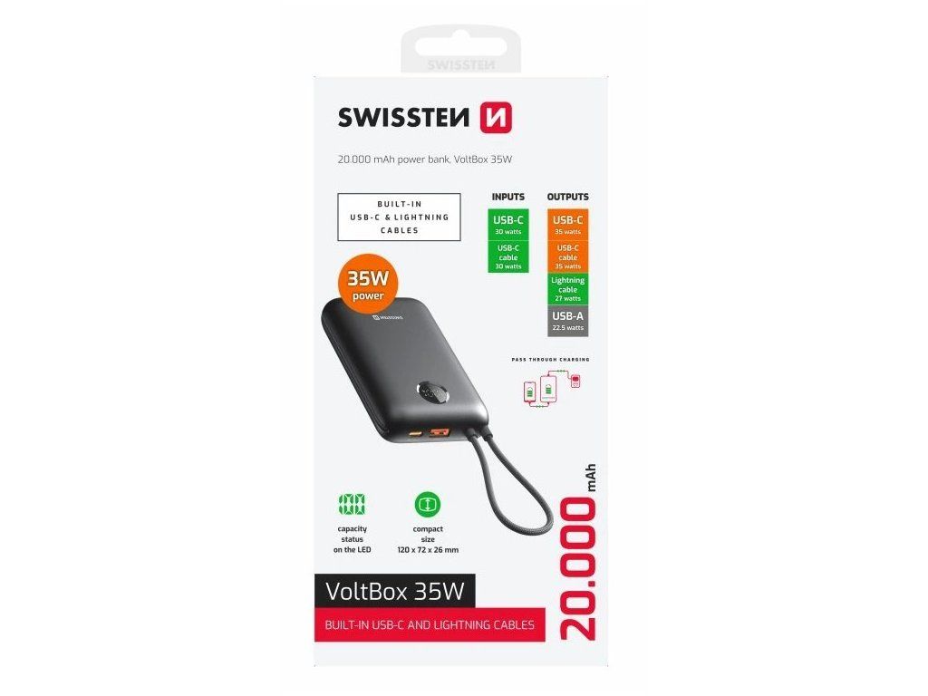 S powerbankou SWISSTEN VOLTBOX 35 W 20 000 mAh máte zdroj energie pro vaše zařízení kdykoli a kdekoli po ruce. Kompaktní rozměry a nízká váha umožňují snadné přenášení, konstrukce z ohnivzdorného plastu zase bezpečnou manipulaci a ochranu proti poškození. Zavděčí se i náročným uživatelům, kteří potřebují nabíjet více zařízení najednou. Mezi hlavní přednosti patří integrované kabely, které usnadní nabíjení a prakticky eliminují zdlouhavé hledání toho správného konektoru.