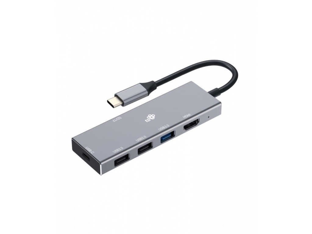 TB Adapter HUB USB C 7v1 - HDMI, USBx3, PD, SD/TF Adaptér umožňuje rozšířit možnosti notebooku, tabletu nebo chytrého telefonu - jeden port USB C na zařízení se změní na multifunkční rozbočovač: *USB3.0: přenos 5 Gb/s *USB2.0 (x2): přenos 480 Mb/s *HDMI: 4K 30Hz *USB C (PD - Power Delivery) *Čtečka karet SD/TF (SD, SDHC, Micro SD, MMC, SDXC) *Funguje prakticky se všemi zařízeními s portem USB C. Lze jej použít k připojení: chytrých telefonů, projektorů, tabletů, myší, klávesnic, monitorů, notebooků, pevných disků, flash disků a fotoaparátů. Není nutná instalace softwaru. Čtečka karet funguje oboustranně (můžete přenášet data z karty do zařízení i ze zařízení na kartu). Port USB C umožňuje nabíjení hlavního zařízení, zatímco jsou k němu připojeny další periferie. Hliníkový kryt zabraňuje zahřívání adaptéru. Balení: kartonová krabice Doživotní záruka Konektory #1: USB typu C samec Konektory #2: USB typu A samice x3 Standard: USB 3.0/USB 3.1 gen 1 Barva: grafitováDodatočné parametre