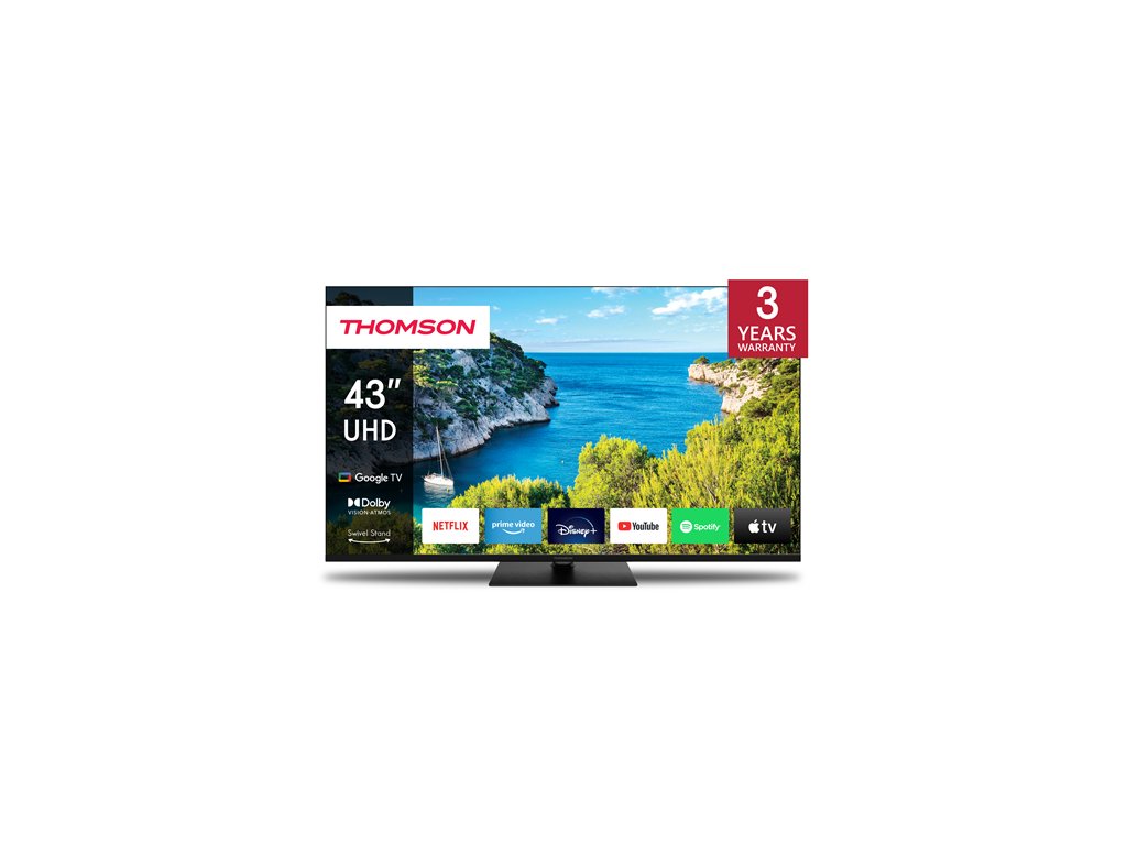 Vychutnajte si filmovú kvalitu obrazu na Thomson Google TV UHD. Google TV zjednodušuje váš zážitok zo zábavy organizovaním obsahu z vašich aplikácií a predplatných. Vytvorte si viacero používateľských profilov a využite vybrané odporúčania. Vychutnajte si širokú škálu inteligentných funkcií, ako je prístup k viac ako 400 000 filmom a televíznym reláciám, inteligentné hlasové ovládanie pomocou služby Google Assistant a Google Cast na streamovanie obsahu z kompatibilných inteligentných zariadení do vášho televízora. Ponorte sa do krištáľovo čistého obrazu v rozlíšení 4K UHD, ktoré zachytí každý detail vďaka štvornásobne vyššiemu rozlíšeniu ako Full HD. Technológia HDR10 vylepšuje každú scénu bohatými kontrastmi a vyváženým jasom, čím zabezpečuje presnú reprodukciu farieb a realistickú kvalitu obrazu. Ergonomické diaľkové ovládanie s hladkým podsvietením vám umožňuje mať všetko pod kontrolou, a to aj pri slabom osvetlení. Integrovaný Google Assistant vám umožňuje intuitívne ovládať televízor hlasovými povelami. Vyhľadávajte si obľúbené filmy, vyžiadajte si odporúčania na základe nálady alebo ovládajte kompatibilné inteligentné zariadenia – to všetko pohodlne pomocou hlasu. Využite zvýšenú flexibilitu umiestnenia s centrálnym otočným stojanom a vylepšite si zážitok zo sledovania. Inovatívny dizajn vám umožňuje bez námahy otočiť televízor až o 30 stupňov, čo vám umožní nájsť perfektný uhol pre vašu zábavnú zostavu. Vstavaný trojitý tuner umožňuje príjem cez satelitnú anténu, pozemnú anténu alebo káblovú televíziu. Môžete teda prijímať všetky dostupné kanály bez dodatočného hardvéru. PICTURE/DISPLAY Screen size (inch / cm) 43" / 109 cm Technology type Direct LED Display frequency (Hz) 60 CPU CA75@1.3Ghz + CA55@1.15GHz Display resolution 3840 x 2160 (4K UHD) Viewing angle (°) 178/178 Colour bit depth 10 bits (1 billion) Dolby Vision Áno HDR 10 Adaptive deinterlacing Áno Dynamic Noise Reduction Áno SOUND AV Stereo Áno Audio power output (W) 2x 8 Equalizer/Balance Áno Dolby Digital 2.0 Áno Dolby Digital 5.1 Áno Dolby Atmos Áno Digital Surround Áno SMART FEATURES Smart OS Google TV™ (Android™ 12) HbbTV Áno Media Player Áno Voice control Google Assistant Chromecast built-in Áno CONNECTIVITY Built-in Wi-Fi Áno Bluetooth Áno HDMI ports total 2x 2.1 | 2x 2.0 HDMI eARC Áno HDMI CEC Áno USB 2.0 ports 2 USB 3.0 ports 1 S/PDIF (coaxial/optical) 1x optical AV IN Áno Ethernet (RJ-45) Áno CI+ Áno DVB-T/T2/C/S/S2 Áno HEVC/H.265 Áno Sat: DiSEqC 1.0 / 1.1 / 1.2 Unicable I / Unicable II Áno Headphones Áno GENERAL DATA Energy class (SDR) F Energy consumption in kWh/1000h (SDR) 50 Energy class (HDR) F Energy consumption in kWh/1000h (HDR) 51 Wall mount VESA (not incl.) 200x200 Stand/feet Central Swivel Stand Color Black Dimensions without stand (WxDxH) 957x89x556 Dimensions with stand (WxDxH) 957x281x587 Carton dimensions (WxDxH) 1060x162x675 Weight without carton (kg) 10 Weight with carton (kg) 12,5 Assembled in Hungary EAN Code 9120106662238Dodatočné parametre