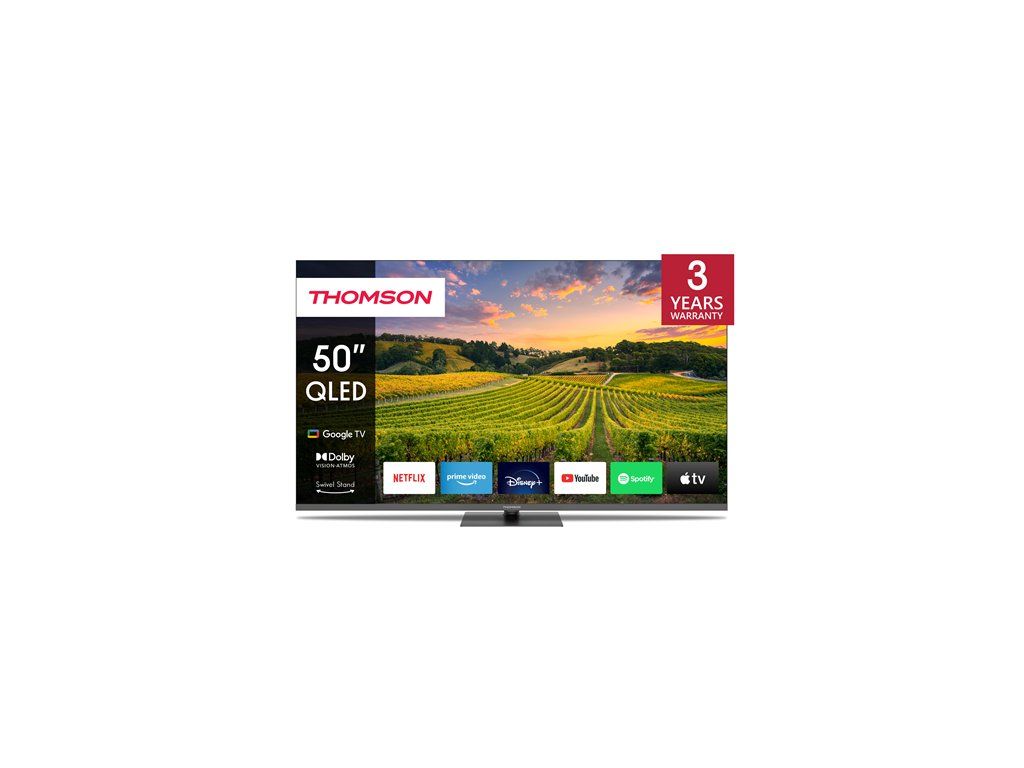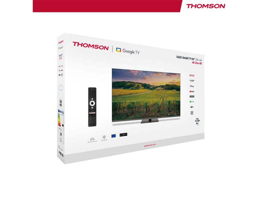 Vychutnajte si svoju obľúbenú zábavu v úžasnej 4K UHD kvalite s vaším Thomson Google TV QLED. Vďaka nanokryštálom Quantum Dot poskytuje QLED displej vyvážený jas, výrazné kontrasty a rozšírený rozsah farieb. V kombinácii s rozlíšením 4K Ultra HD môžete zachytiť každý detail a ponoriť sa do krištáľovo čistého obrazu. Technológia Dolby Vision zvyšuje jas v každej scéne a zaisťuje presnú reprodukciu farieb pre realistický obraz. Vychutnajte si dynamický zvuk s Dolby Atmos pre pohlcujúci televízny zážitok. Google TV zjednodušuje váš zážitok zo zábavy organizovaním obsahu z vašich aplikácií a predplatných. Vytvorte si viacero používateľských profilov a využite vybrané odporúčania. Vychutnajte si širokú škálu inteligentných funkcií, ako je prístup k viac ako 400 000 filmom a televíznym reláciám, inteligentné hlasové ovládanie pomocou služby Google Assistant a Google Cast na streamovanie obsahu z kompatibilných inteligentných zariadení do vášho televízora. Ergonomické diaľkové ovládanie s hladkým podsvietením vám umožňuje mať všetko pod kontrolou, a to aj pri slabom osvetlení. Integrovaný Google Assistant vám umožňuje intuitívne ovládať televízor hlasovými povelami. Vyhľadávajte svoje obľúbené filmy, žiadajte o odporúčania na základe nálady alebo ovládajte kompatibilné inteligentné zariadenia – to všetko pohodlne pomocou hlasu. Využite zvýšenú flexibilitu umiestnenia s centrálnym otočným stojanom a vylepšite si zážitok zo sledovania. Inovatívny dizajn vám umožňuje bez námahy otočiť televízor až o 30 stupňov, čo vám umožní nájsť perfektný uhol pre vašu zábavnú zostavu. Vstavaný trojitý tuner umožňuje príjem cez satelitnú anténu, pozemnú anténu alebo káblovú televíziu. Môžete teda prijímať všetky dostupné kanály bez dodatočného hardvéru. PICTURE/DISPLAY Screen size (inch / cm) 50" / 126 cm Technology type Direct LED Display frequency (Hz) 60 CPU CA75@1.3Ghz + CA55@1.15GHz Display resolution 3840 x 2160 (4K UHD) Viewing angle (°) 178/178 Colour bit depth 10 bits (1 billion) Dolby Vision Áno HDR 10 Adaptive deinterlacing Áno Dynamic Noise Reduction Áno QLED Áno SOUND AV Stereo Áno Audio power output (W) 2x 10 Equalizer/Balance Áno Dolby Atmos Áno Digital Surround Áno SMART FEATURES Smart OS Google TV™ (Android™ 12) HbbTV Áno Media Player Áno Voice control Google Assistant Chromecast built-in Áno CONNECTIVITY Built-in Wi-Fi Áno Bluetooth Áno HDMI ports total 2x 2.1 | 2x 2.0 HDMI eARC Áno HDMI CEC Áno USB 2.0 ports 2 USB 3.0 ports 1 S/PDIF (coaxial/optical) 1x optical AV IN Áno Ethernet (RJ-45) Áno CI+ Áno DVB-T/T2/C/S/S2 Áno HEVC/H.265 Áno Sat: DiSEqC 1.0 / 1.1 / 1.2 Unicable I / Unicable II Áno Headphones Áno GENERAL DATA Energy class (SDR) F Energy consumption in kWh/1000h (SDR) 64 Energy class (HDR) F Energy consumption in kWh/1000h (HDR) 65 Wall mount VESA (not incl.) 200x200 Stand/feet Central Swivel Stand Color Dark gray Dimensions without stand (WxDxH) 1111x75x643 Dimensions with stand (WxDxH) 1111x281x676 Carton dimensions (WxDxH) 1210x142x763 Weight without Carton (kg) 13 Weight with Carton (kg) 15,7 Assembled in Hungary EAN Code 9120106662290Dodatočné parametre