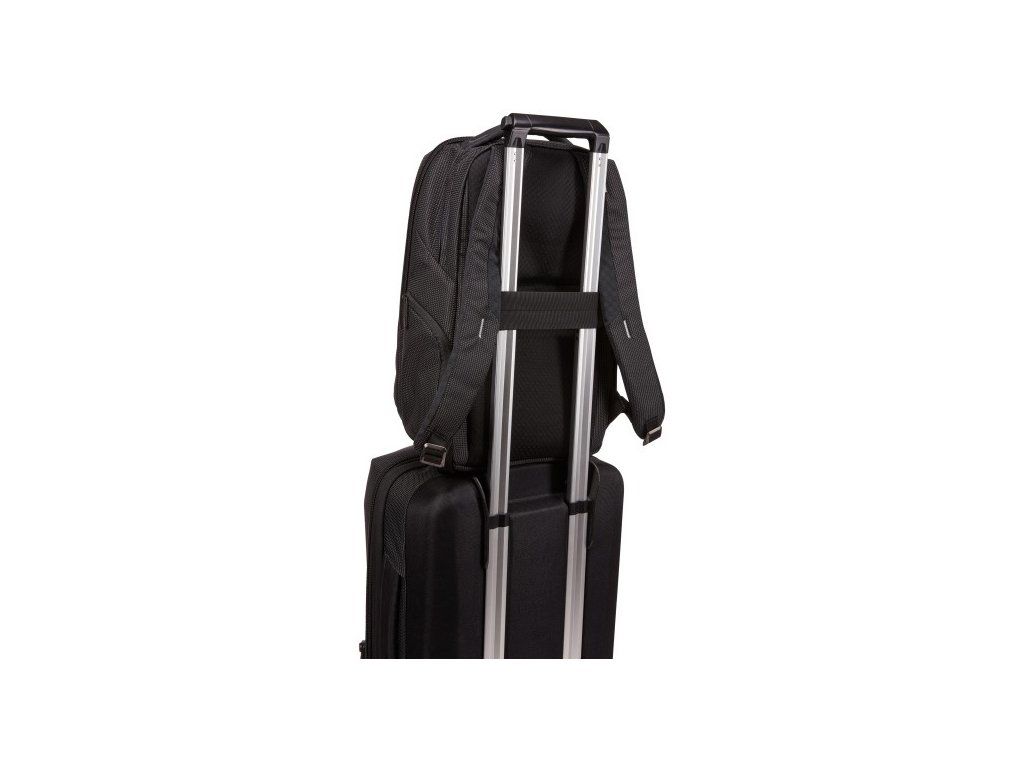 Bezpečné zavesenie batohu na batožinu s kolieskami pomocou integrovaného pásu s otvorom.