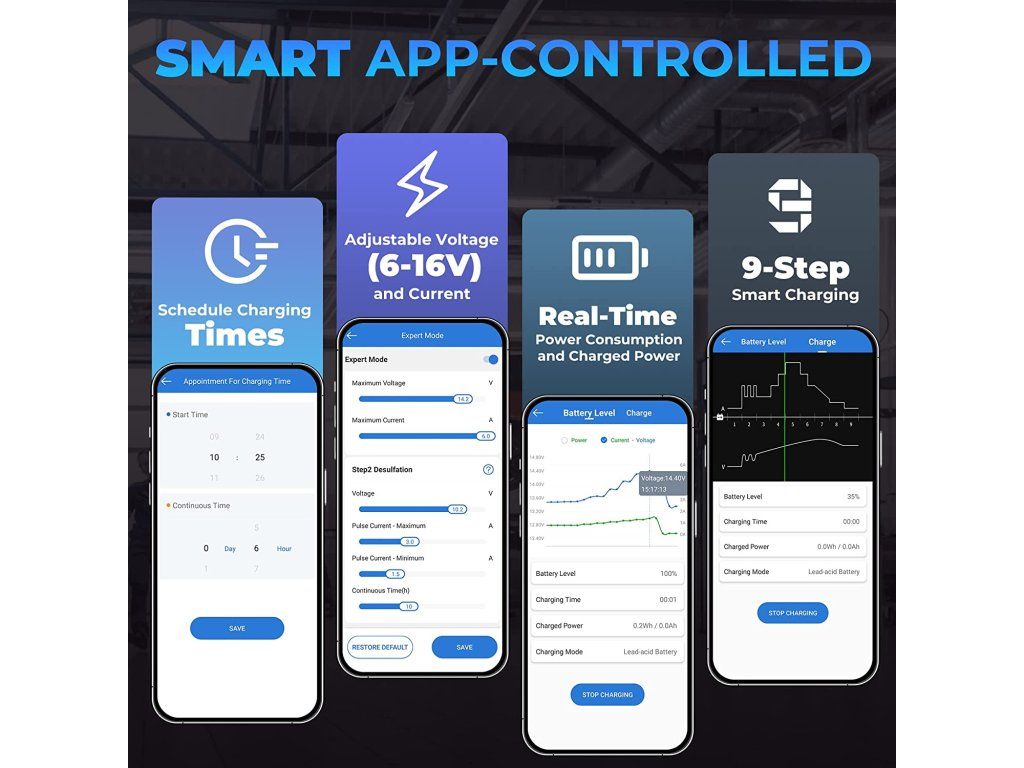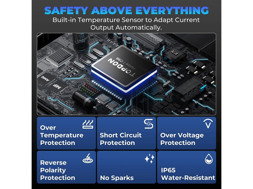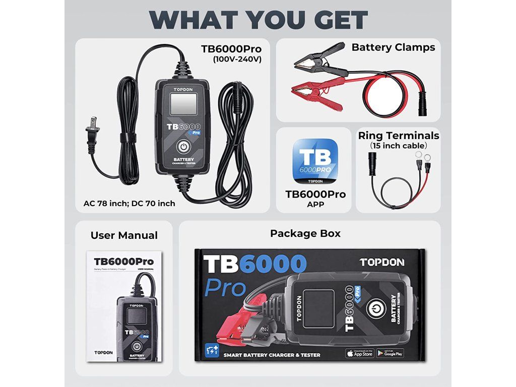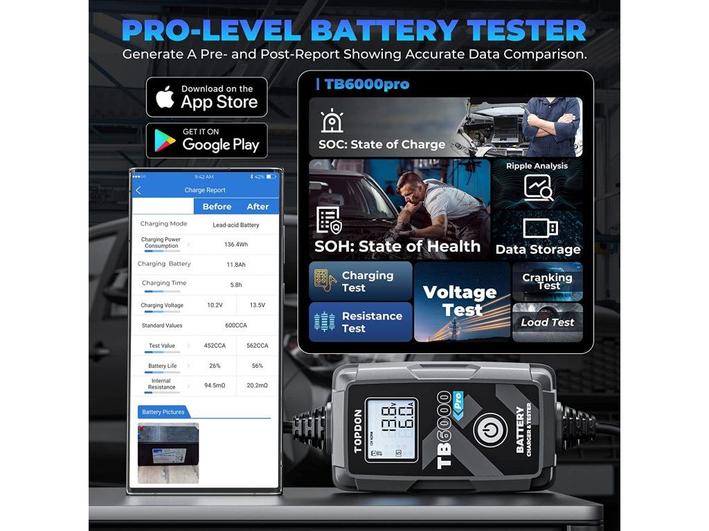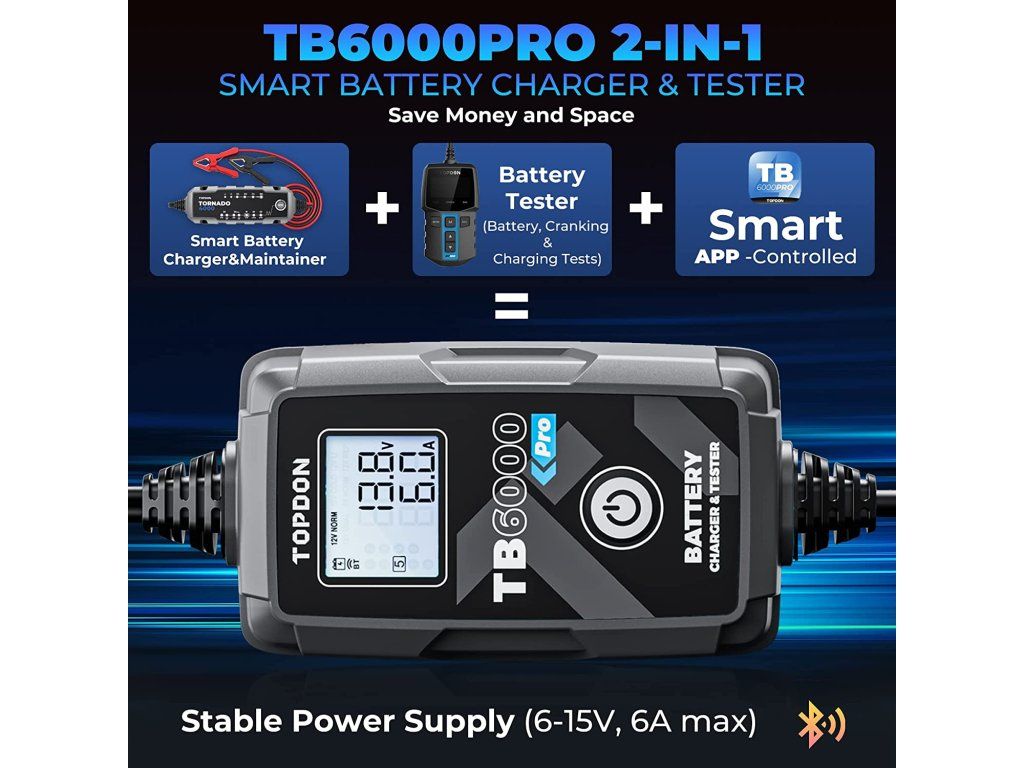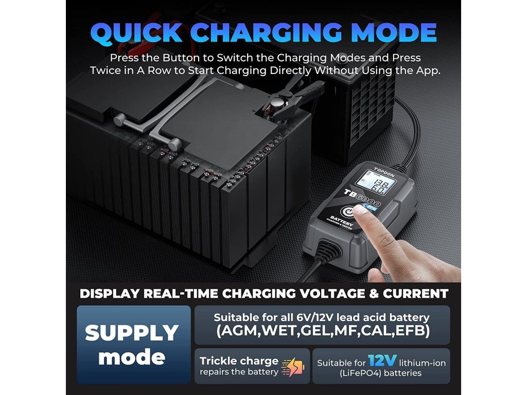 TOPDON TB6000Pro Chytrá nabíječka a tester baterií 2v1! Perfektní kombinace chytré automobilové nabíječky a profesionálního testeru baterií. S tímto zařízením získáváte výkonný, multifunkční nástroj, který šetří peníze, místo a ulehčí Vám s používáním několika nástrojů současně. Chytré nabíjení s Pre- a Post- reportem o stavu baterie a stavu nabíjení. TOPDON TB6000Pro nabízí jako první v oboru inteligentní režim nabíjení, který dokáže zobrazit zprávu před a po nabíjení, která ukazuje přesné srovnání dat. V režimu inteligentního nabíjení provede TB6000Pro automaticky předběžnou detekci baterie, jakmile ji začnete nabíjet, a umožní vám znovu otestovat baterii pomocí funkce ''View Report'', která vygeneruje předběžnou a následnou zprávu. Porovnáním údajů včetně CCA, vnitřního odporu, napětí a technického stavu zpráva jasně zobrazí, o kolik se baterie po nabití zlepšila. Zprávy o testování můžete také uložit do svého telefonu a kdykoli si je prohlédnout. Beginner a Expert mód Inovativní microprocesorová technologie - Více kontroly. Vyšší efektivita. Více práce. Beginner Mode (Režim pro začátečníky): Chytrá nabíječka TB6000Pro si klade za cíl zjednodušit proces nabíjení pro domácí kutily, zejména pro začátečníky, a to prostřednictvím režimu Beginner Mode (''režimu pro začátečníky''). Stačí vybrat vhodný režim odpovídající Vašemu složení baterie a kliknout na tlačítko 'Start Charging' a poté můžete nechat Vaši baterii automaticky nabíjet. Expert Mode (Režim pro profesionály): Pro profesionální techniky podporuje TB6000Pro režim ''Expert Mode'', který umožňuje nastavit více hodnot v rámci 9stupňového nabíjení jako jsou proud, napětí, pulzní proud a doba trvání. Zároveň také zobrazuje průběh nabíjení, napětí, proud, a to vše v reálném čase. 9stupňový inteligentní nabíjecí proces Jste už unavení individuálním nastavováním nabíjení? Nechte TB6000Pro udělat práci za Vás. Patentované 9stupňové inteligentní nabíjení společnosti TOPDON poskytuje Vaší baterii optimalizovaný, udržovaný a integrovaný proces nabíjení. 9stupňové inteligentní nabíjení se skládá z těchto stupňů: Diagnosis (diagnostika) Desulphation (desulfatace) Pre-Charge (přednabití) Soft Start Bulk Charge Absorption (absorpce) Analysis (analýza) Recondition (rekondice) Maintenance (údržba) Napájejte Vaši baterii a prodlužte tak její životnost! Díky pulzně-šířkové modulaci, která rozkládá sulfáty ve stárnoucí baterii, dokáže TB6000Pro účinně obnovit odpor baterie a prodloužit tak její životnost. Předběžný a výsledný test baterie poté jasně ukáže, jak TB6000Pro a její nabíjecí režim zlepšuje odpor na baterii. Spolehlivé nabíjecí řešení. Společnost TOPDON disponuje rozsáhlou databází automobilových baterií, která slouží jako důležitý zdroj dat pro výzkumný a vývojářský tým, aby mohl následně zákazníkům nabídnout vhodné řešení nabíjení. Pokud uživatelé souhlasí s nahráváním svých údajů o nabíjení do aplikace, může společnost TOPDON neustále optimalizovat algoritmus nabíjení a poskytovat efektivnější řešení na základě údajů z reálných zkušeností a dat. Časované automatické nabíjení. Nastavení doby nabíjení v aplikaci je stejně snadné jako nastavení budíku. TB6000Pro dokáže nabíjet a monitorovat baterii i během toho, co vy v klidu odpočíváte nebo spíte. Tato funkce časovaného nabíjení může baterii nabít i mimo špičku. Jedna nabíječka pro všechno. Kompatibilní se všemi typy 6V a 12V olovo-kyselinových baterií a 12V lithiových baterií (LiFePO4). Podporuje i více typů baterií: LI, zaplavené, gelové, MF, CAL, EFB, AGM. TB6000Pro dokáže nabíjet Vaše baterie až v 6 nabíjecích režimech: 12V / 6A (NORM/LI/SUPPLY) 12V / 3A SMALL 12V / 1A REPAIR 6V / 3A NORM Snadná kontrola dat kdykoli. TB6000Pro obsahuje funkci přehledu dat, takže se uživatelé mohou znovu podívat na zprávy o nabíjení v průběhu 6 měsíců a na informace týkající se testů baterie. Rozšířené možnosti testování baterií. S modelem TB6000Pro zvládnete ještě více úkolů. Pomocí Kelvinovy testovací metody dokáže TB6000Pro přesně zjistit SOC, SOH atd. u různých typů baterií. TB6000Pro podporuje podrobné testy nabíjení a 'cranking' testy pro 12V a 24V a poskytuje vynikající diagnostiku baterií prostřednictvím mobilní aplikace. Bezpečné, vodě a prachu odolné! TB6000Pro lze používat při vysokých teplotách a ve vlhkém prostředí. Je vodotěsný a odolný vůči nečistotám. Ještě více ochrany! Díky inteligentním bezpečnostním funkcím TB6000Pro jsou uživatelé chráněni proti přepólování, jiskření, zkratu, přehřátí a přepětí. Technické speficikace Vstupní napětí 100-240V Výstupní proud 1-6A Výstupní napětí 6-16V Nabíjecí režimy 12V/6A (NORM/LI/SUPPLY), 12V/3A SMALL, 12V/1A REPAIR, 6V/3A NORM Vhodné pro baterie s kapacitou 5-240Ah Vhodné pro baterie typu LI, zaplavené, gelové, MF, CAL, EFB, AGM Délka AC (přívodního) kabelu 2m Délka DC kabelu (svorky) 1,8m Nabíjecí metoda 9stupňový inteligentní nabíjecí proces IP ochrana IP65 Další ochranné mechanismy Ochrana proti přepólování, jiskření, přebíjení, nadproudy, otevřenými obvody, zkraty a přehřátímDodatočné parametre