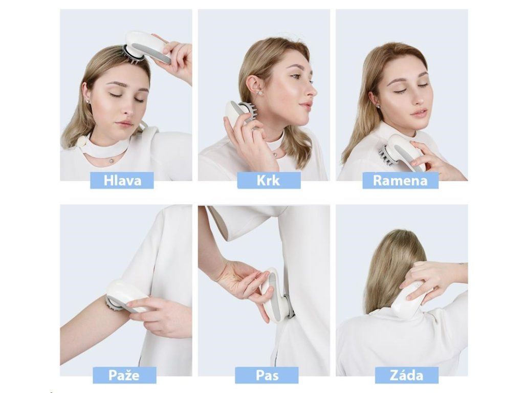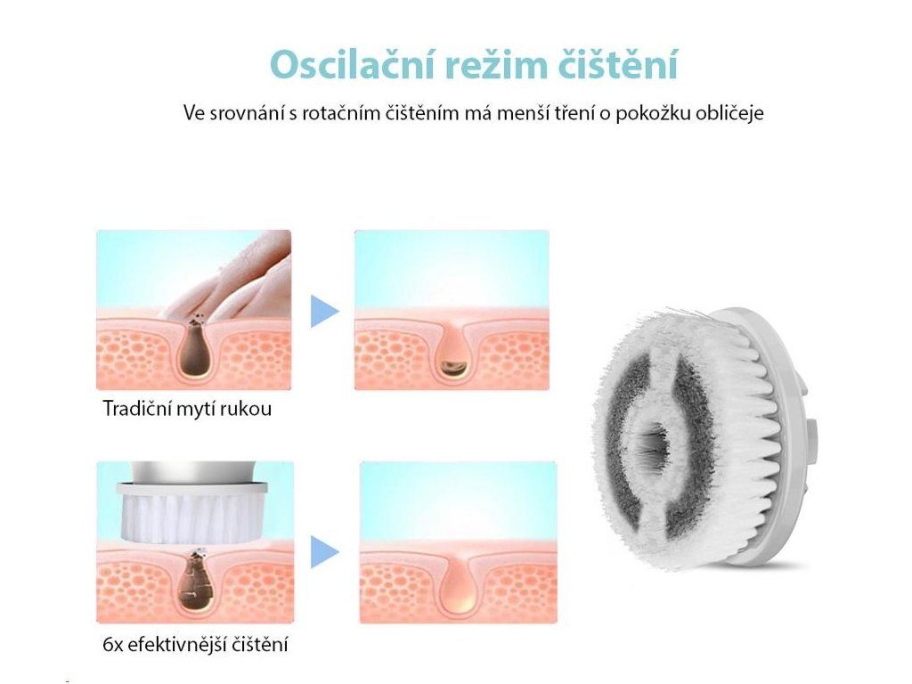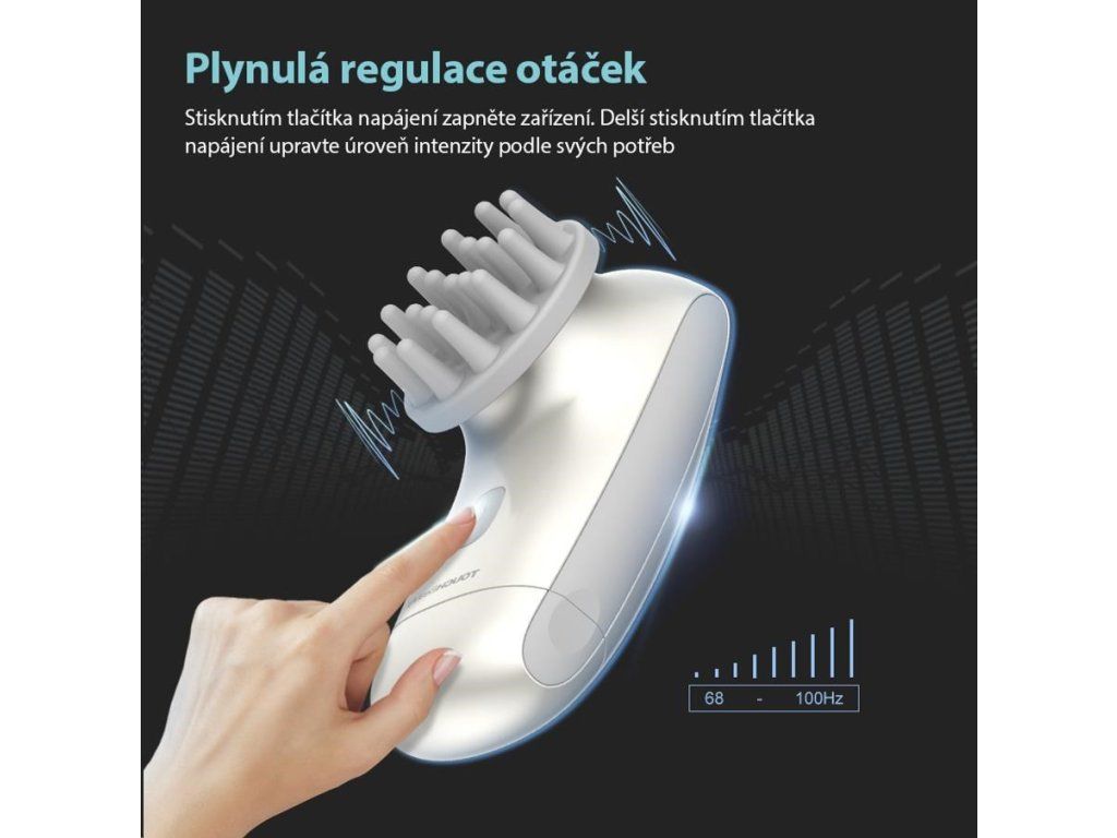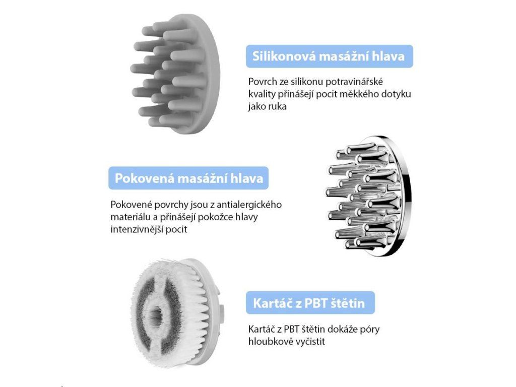 Mäkká masážna hlavica používa mäkké silikónové výstupky, ktoré jemne masírujú pokožku a uvoľňujú napätie a únavu. Zlepšuje tiež prekrvenie pokožky hlavy. Hrubé masážne hlavice používajú tvrdé výstupky, ktoré stimulujú spánok, podporujú pocit uvoľnenia, zlepšujú krvný obe a pomáhajú podporiť zdravý rast vlasov. Kefková hlavica pre čistenie tváre má mäkké hodvábne štetiny, ktoré jemne čistia pleť. Sonické vibrácie pomáhajú štetinám lepšie sa dostať do pórov a odstrániť z pleti nečistoty, prebytočnú mastnotu a zvyšky make-upu.