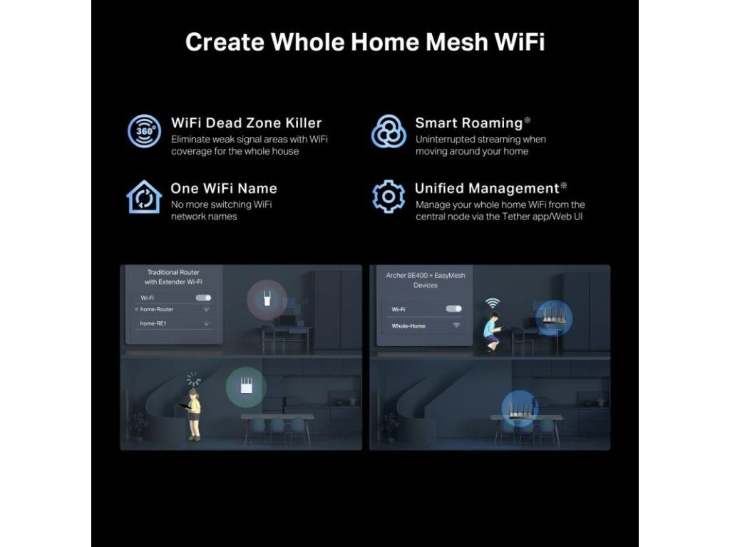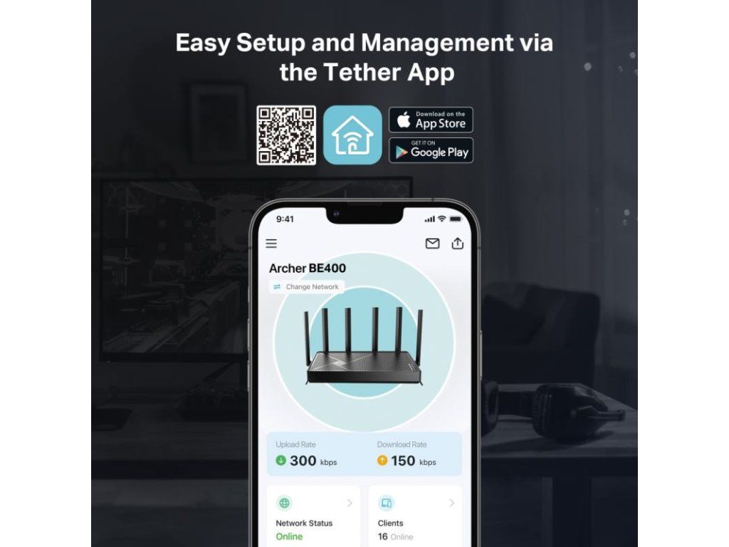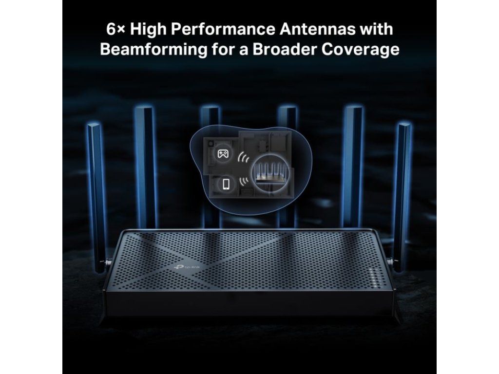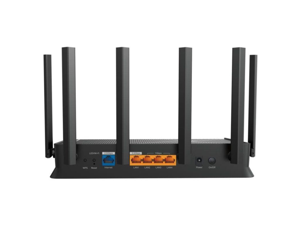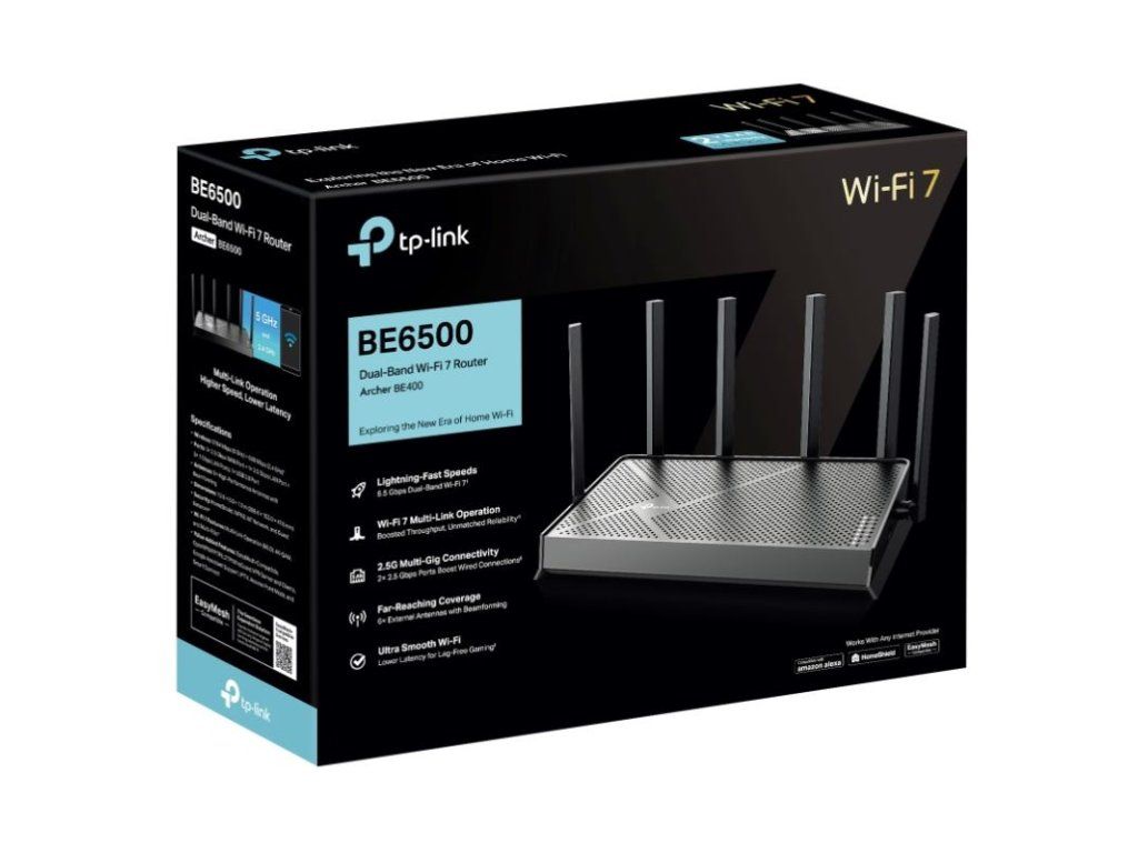 TP-LINK Archer BE400 BE6500 Wi-Fi 7 Router - Dvojpásmová Wi-Fi 7 s rýchlosťou 6,5 Gb/s. Prenáša dáta s klientmi Wi-Fi 7 vo viacerých pásmach súčasne, aby sa zvýšila priepustnosť, znížilo oneskorenie a zlepšila spoľahlivosť pri rôznych sieťových správaniach. × 2,5 Gb/s WAN port, 1× 2,5 Gb/s LAN port a 3× 1 Gb/s LAN porty ponúkajú vysokorýchlostný prenos dát. 6× externé antény spolu s technológiou Beamforming poskytujú väčšiu kapacitu, silnejšie a spoľahlivejšie pripojenie a menej rušenia. Kompatibilný s routermi a extendermi EasyMesh, ktoré vytvárajú bezproblémovú Wi-Fi mesh sieť pre celú domácnosť a zabraňujú výpadkom a oneskoreniu pri prechode medzi signálmi. TP-Link HomeShield