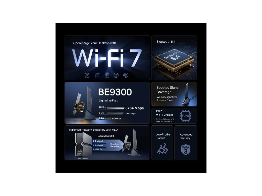 TP-Link Archer TBE553E – Wi-Fi 7 PCIe adaptér Tento adaptér nabízí bezkonkurenční třípásmovou rychlost až 5764 Mb/s (6 GHz), 2882 Mb/s (5 GHz) a 688 Mb/s (2,4 GHz) díky standardu Wi-Fi 7. Intel® čipová sada zajišťuje nižší latenci a spolehlivé připojení. Dvě všesměrové antény s magnetickou základnou poskytují širší pokrytí signálem. Hlavní výhody * Standard Wi-Fi 7 – čistší a širší pásmo 6 GHz * Nižší latence a vyšší spolehlivost díky Intel® Wi-Fi 7 čipsetu * Širší pokrytí signálem se dvěma vysokoziskovými tri-band anténami * Bluetooth 5.4 – vyšší bezpečnost a spolehlivost * WPA3 zabezpečení – moderní ochrana hesel * Zpětná kompatibilita se standardy 802.11be/ax/ac/a/b/g/n Hardware * Rozměry (Š×D×V): 78,5 × 120,8 × 21,5 mm * Antény: 2× High-Gain Tri-Band Antennas s magnetickou základnou Bezdrátové specifikace Standardy: IEEE 802.11a/b/g/n/ac/ax/be Rychlosti WLAN: * 6 GHz: až 5764 Mbps (11be), až 2402 Mbps (11ax) * 5 GHz: až 2882 Mbps (11be), až 2402 Mbps (11ax), až 1732 Mbps (11ac) * 2,4 GHz: až 688 Mbps (11be), až 574 Mbps (11ax), až 300 Mbps (11n) Citlivost příjmu: * 6 GHz: 11ax HE20 MCS0: -94 dBm, 11be EHT320 MCS13: -44 dBm * 5 GHz: 11ac VHT20 MCS0: -94 dBm, 11be EHT160 MCS13: -48 dBm * 2,4 GHz: 11n HT20 MCS0: -95 dBm, 11be EHT40 MCS13: -56 dBm Výkon vysílání: * 6 GHz: 12 dBm (FCC) * 5 GHz: 20 dBm (FCC) / 15 dBm (CE) * 2,4 GHz: 20 dBm (FCC) / 16 dBm (CE) Mód: Infrastructure mode Bezpečnost: WEP, WPA/WPA2/WPA3 (Personal/Enterprise), WPA-PSK/WPA2-PSK Obsah balení * Archer TBE553E PCIe adaptér * Magnetická anténa s 0,8 m RF kabelem * Low-profile bracket * Bluetooth header kabel * Rychlý instalační průvodce a CD s nástroji Systémové požadavky * Windows 10 nebo 11 (64-bit) * Pro podporu MLO: Windows 11 (verze 24b nebo novější) Provozní prostředí * Provozní teplota: 0°C ~ 40°C * Provozní vlhkost: 10% ~ 90% (ne-kondenzující) * Skladovací vlhkost: 5% ~ 90% (ne-kondenzující) Příslušenství * Extension Cable Length: 0.8 m * Bluetooth Header Cable Length: 0.3 m Certifikace * FCC, CE, RoHS Odkaz na web výrobce: https://www.tp-link.com/cz/home-networking/pci-adapter/archer-tbe553eDodatočné parametre