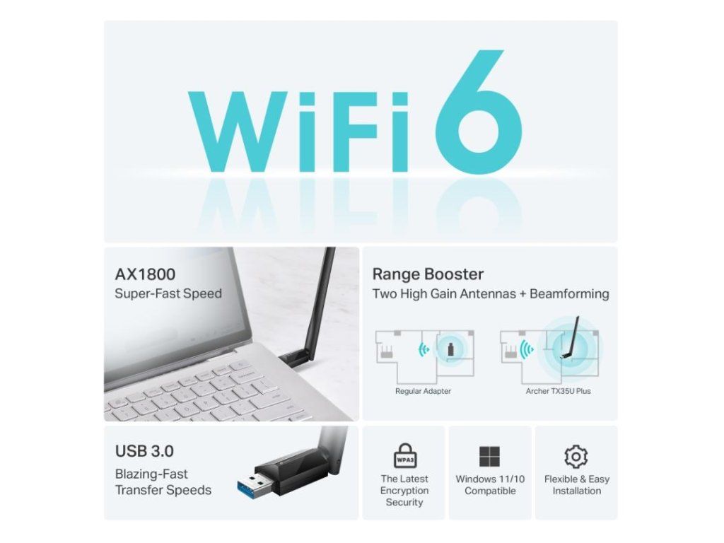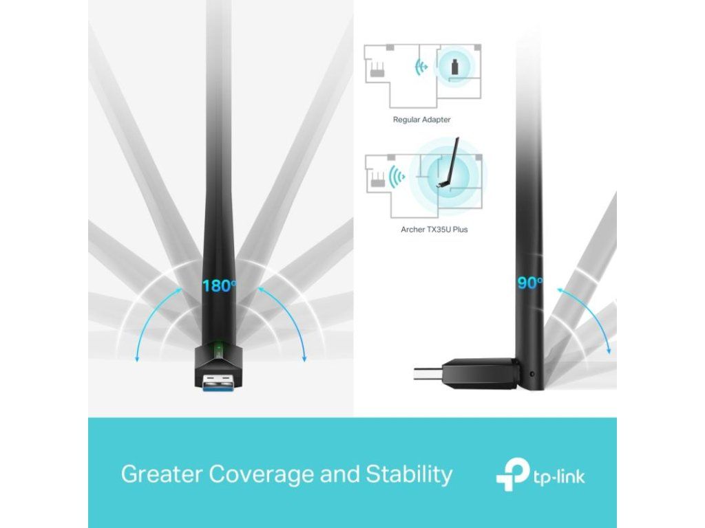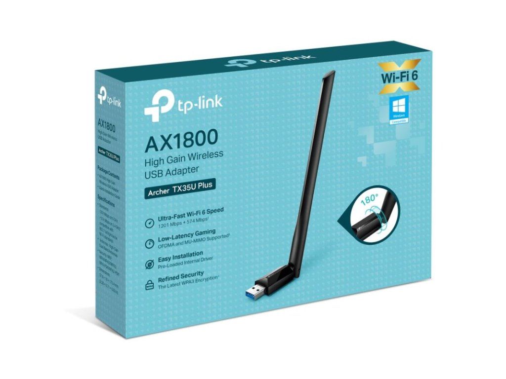 Archer TX35U Plus je vysoko výkonný bezdrôtový USB adaptér, ktorý umožňuje vášmu počítaču pripojiť sa k sieti Wi-Fi 6 s rýchlosťou až 1800 Mbps.