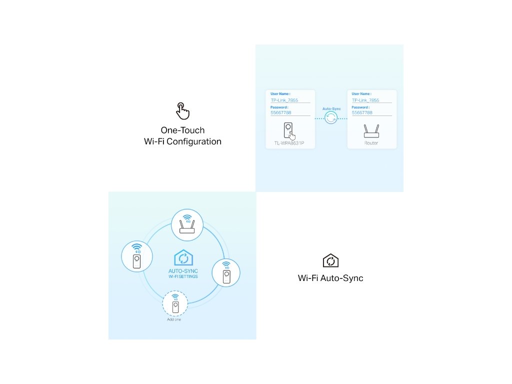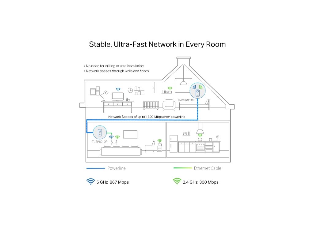 Kvalitný Gigabitový Powerline Kit pre rozšírenie Wi-Fi s podporou AC, dvojpásmový (2,4 a 5 GHz), kombinovaná rýchlosť prenosu dát až 1300 Mb / s, 2x2 MIMO, tlačidlo pre klonovanie siete, Auto-Sync, 3x gigabitový port