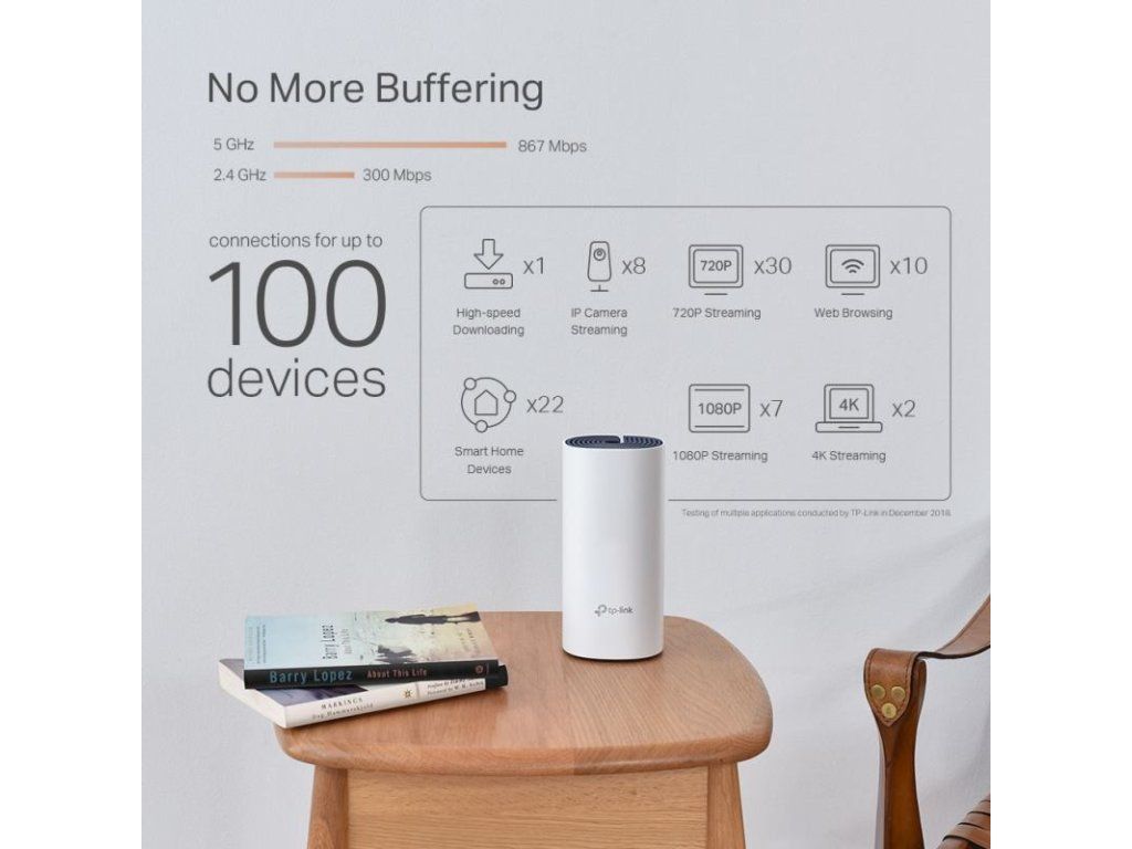 Deco E4 poskytuje rýchle a stabilné spojenie rýchlosťou až 1167 Mb / s a spolupracuje s hlavnými poskytovateľmi internetových služieb (ISP) a modemom. Tento systém je ideálny pre pokrytie bezdrôtovým signálom celej domácnosti (súčasťou balenia sú 3 jednotky) a je tiež kompatibilný s Amazon Alexa a IFTTT .