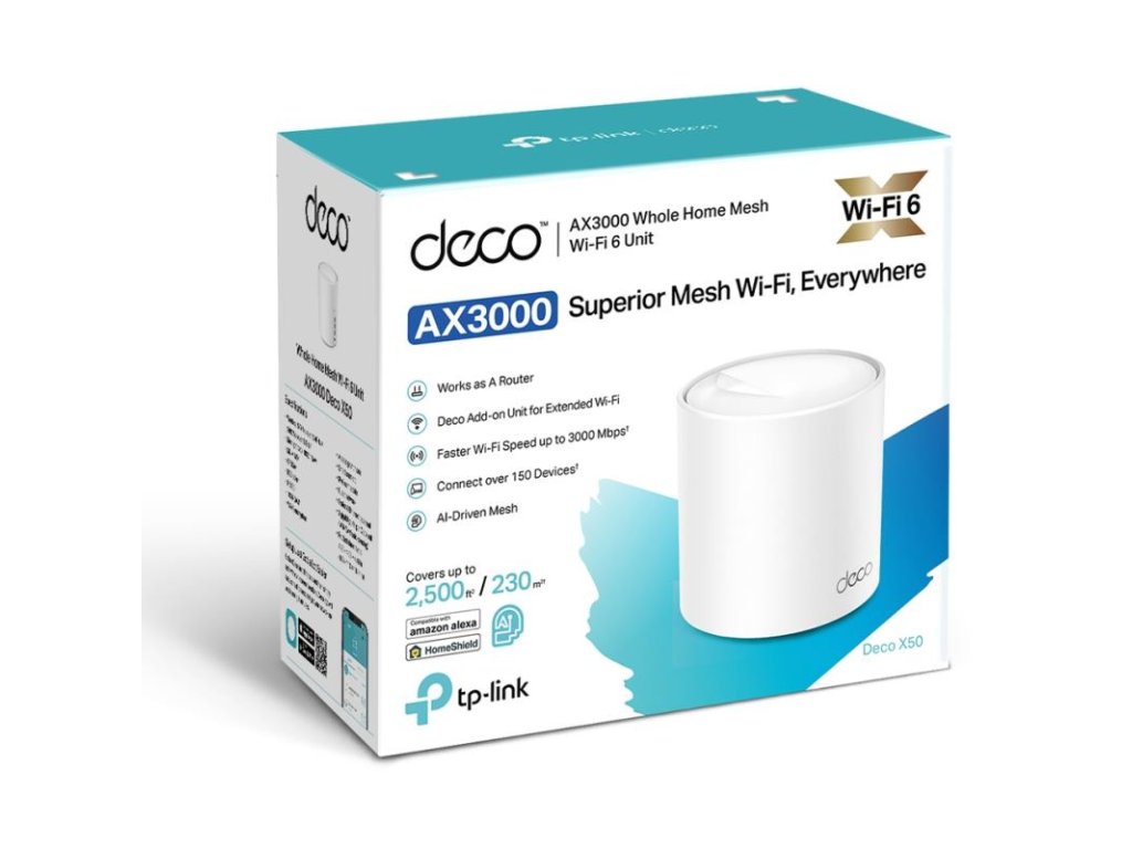 4 toky, menšie oneskorenie 2x2/HE160 2402 Mbps + 2x2 574 Mbps. Gigabit Wired Speed 3x gigabitové porty poskytujú dostatočnú konektivitu. Zvýšené bezproblémové pokrytie bezproblémové sieťové pokrytie WiFi až do cca 760 m2 (1 balenie). AI-Driven Mesh Inteligentne sa učí sieťové prostredie, aby poskytoval ideálne WiFi jedinečné pre váš domov. TP-Link HomeShield poskytuje komplexnú sieťovú ochranu, robustnú rodičovskú kontrolu a ochranu internetu vecí v reálnom čase. Nastavenie je jednoduchšie ako kedykoľvek predtým aplikácia Deco vás krok za krokom prevedie nastavením.