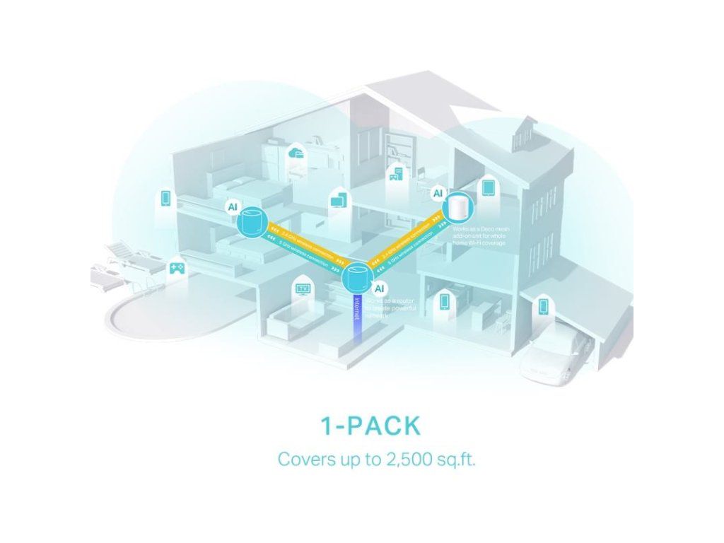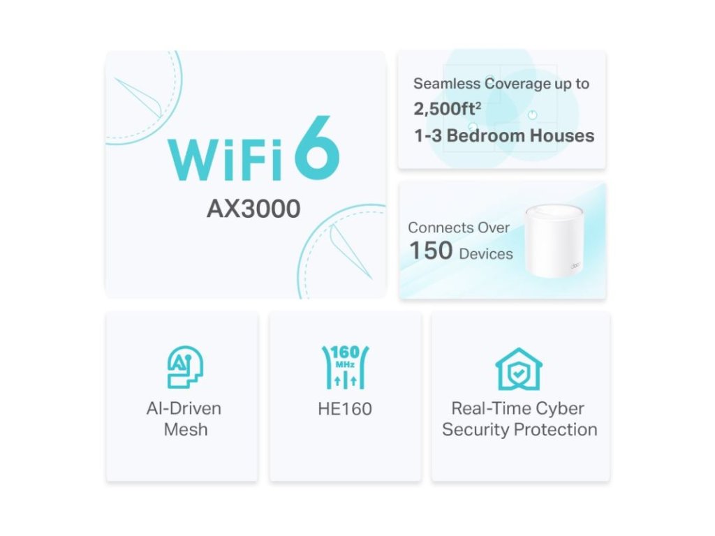 4 toky, menšie oneskorenie 2x2/HE160 2402 Mbps + 2x2 574 Mbps. Gigabit Wired Speed 3x gigabitové porty poskytujú dostatočnú konektivitu. Zvýšené bezproblémové pokrytie bezproblémové sieťové pokrytie WiFi až do cca 1350 m2 (2 balenia). AI-Driven Mesh Inteligentne sa učí sieťové prostredie, aby poskytoval ideálne WiFi jedinečné pre váš domov. TP-Link HomeShield poskytuje komplexnú sieťovú ochranu, robustnú rodičovskú kontrolu a ochranu internetu vecí v reálnom čase. Nastavenie je jednoduchšie ako kedykoľvek predtým aplikácia Deco vás krok za krokom prevedie nastavením.
