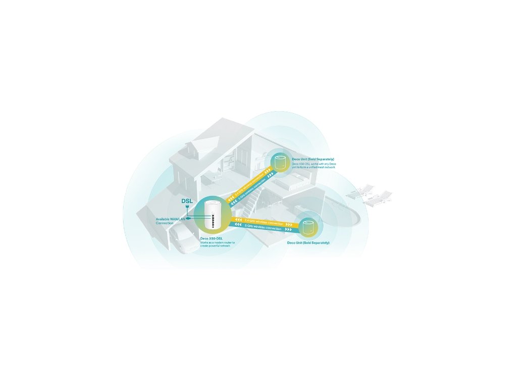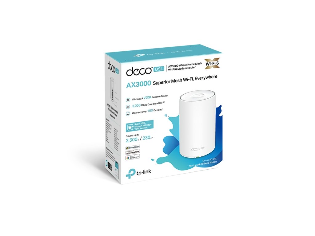 TP-LINK Deco X50-DSL(1-pack), AX3000 VDSL Whole Home Mesh WiFi System WiFi 6 (domáci MESH systém) - VDSL Modem Router + Mesh Wi-Fi. Rýchlosť Super VDSL2 - Podporuje technológiu Profile 35b na prenos dát až 350 Mb/s. Vynikajúce rýchlosti WiFi 6 až 3,0 Gb/s - 2 402 Mb/s (5 GHz) a 574 Mb/s (2,4 GHz) dvojpásmové WiFi s technológiou WiFi 6. Plne gigabitový Ethernet - 4x porty Gigabit WAN/LAN Ethernet poskytujú flexibilný prístup k internetu rýchlosťou warp. TP-Link HomeShield. Skutočná bezproblémová roamingová sieť Wi-Fi