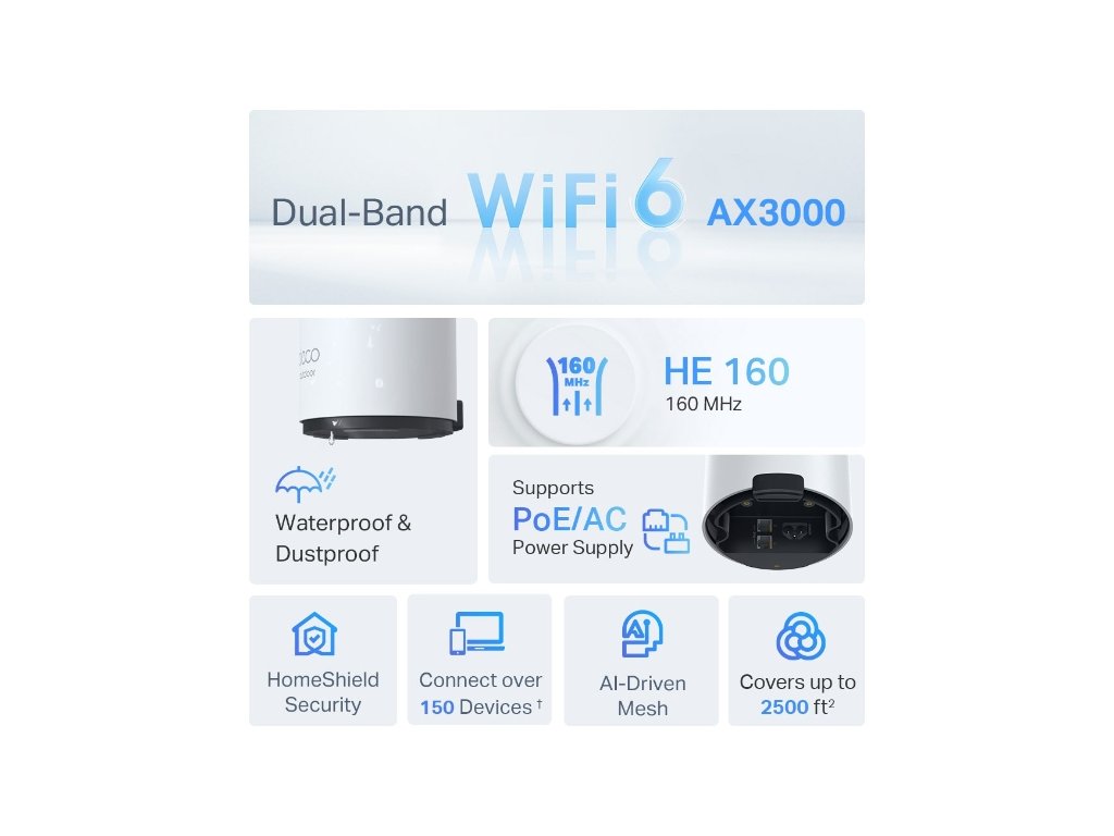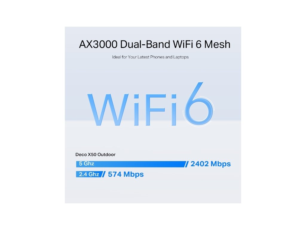 TP-LINK Deco X50-Outdoor(1-pack), AX3000 Whole Home Mesh WiFi 6 - AX3000 Dual-Band Wi-Fi 6- Vychutnajte si neustále sledovanie svojich obľúbených seriálov v rozlíšení 4K s kombinovanými rýchlosťami až 3 000 Mb/s (574 Mb/s na 2,4 GHz a 2 402 Mb/s na 5 GHz). Viaceré možnosti upevnenia - na stôl, na stenu a na tyč. Práca vonku - Certifikovaná vodotesnosť a prachotesnosť. Napájané cez Ethernet - Poskytujte dátové pripojenie aj elektrickú energiu pomocou jediného kábla. Plný gigabitový Ethernet 2 × gigabitové WAN/LAN ethernetové porty poskytujú solídny prístup k internetu pri vysokých rýchlostiach. Work With All Decos - Kompatibilné s každým iným modelom Deco na vytvorenie siete Mesh. TP-Link HomeShield - Poskytuje komplexnú ochranu siete, robustnú rodičovskú kontrolu a v reálnom čase
