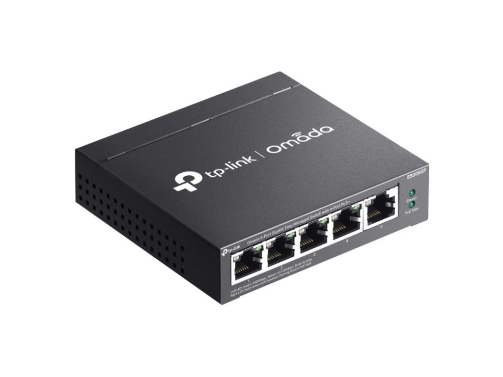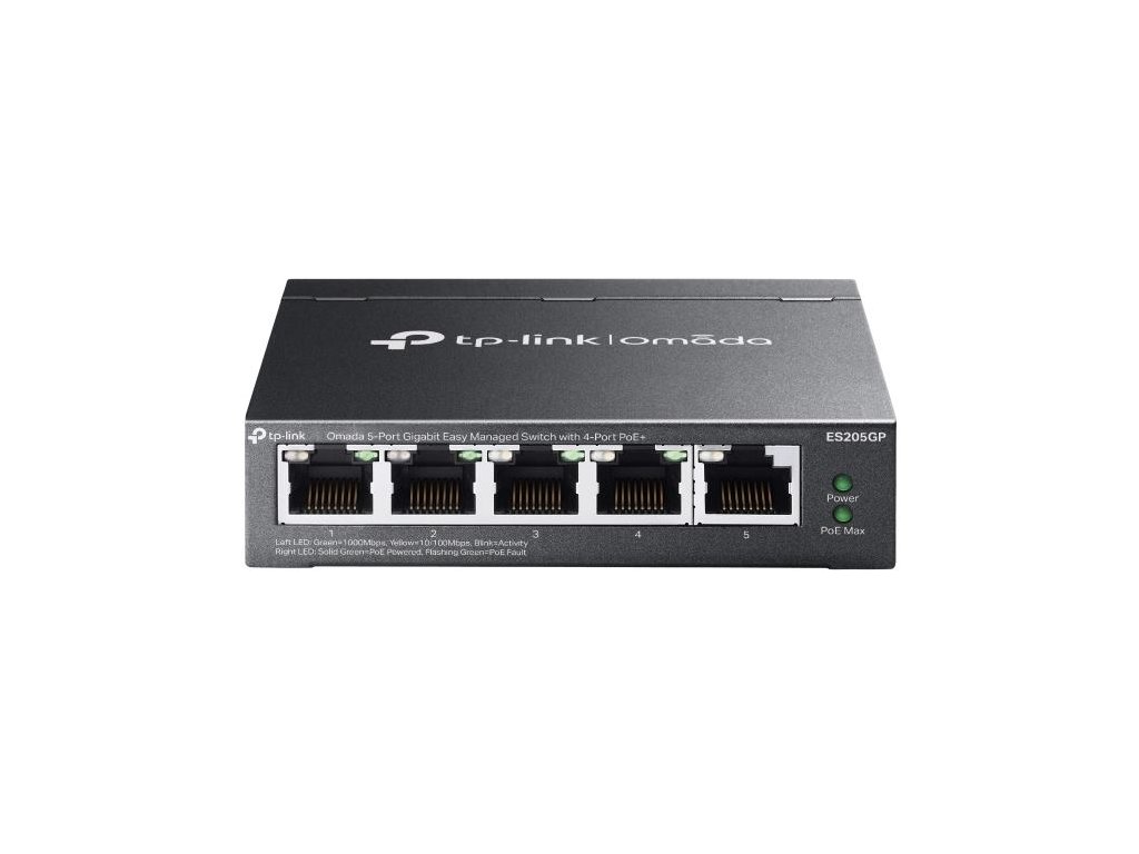 TP-LINK ES205GP, Omada SDN Easy Switch 5-Port/1Gbps/Man/Desk/PoE+ - Omada 5-portový gigabitový jednoducho spravovaný switch s 4-portami PoE+. Tento switch má 5 gigabitových RJ45 portov (4 porty PoE+), s celkovým rozpočtom PoE 65W. Je navrhnutý bez ventilátora, čo zabezpečuje tichú prevádzku. Ponúka jednoduché centralizované riadenie a automatickú prevenciu slučky