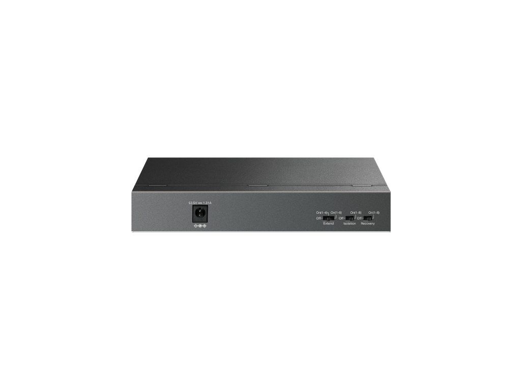 Hardware Interface *9× 10/100 Mbps RJ45 Ports (8× 10/100 Mbps 802.3af/at PoE+ Ports) *AUTO Negotiation *AUTO MDI/MDIX Network Media *10BASE-T: UTP category 3, 4, 5 cable (maximum 100m), EIA/TIA-568 100ohm STP (maximum 100m) *100BASE-TX: UTP category 5, 5e cable (maximum 100m), EIA/TIA-568 100ohm STP (maximum 100m) Fan Quantity *Fanless Installation *Desktop *Wall Mounting Power Supply *External Power Adapter (Output: 53.5 VDC / 1.31 A) PoE+ Ports (RJ45) *Standard: 802.3at/af compliant *PoE Ports: Ports 1–8, up to 30 W PoE output per port *PoE Power Budget: 63W LED Indicator *Power *Link/Act *PoE Status *PoE MAX Dimensions ( W x D x H ) *171×98×27 mm Max Power Consumption *3.67 W (220 V/50 Hz no PD connected) *73.24 W (220 V/50 Hz with 63 W PD connected) Max Heat Dissipation *12.48 BTU/h (220 V/50 Hz no PD connected) *249 BTU/h (220 V/50 Hz with 63 W PD connected) Výkon Switching Capacity *1.8 Gbps Packet Forwarding Rate *1.3392 Mpps MAC Address Table *2K Jumbo Frame *1.5 KB Software Advanced Features *Extend Mode Button (Ports 1–2, Up to 250 m PoE power supply and data transmission) *PoE Auto Recovery Button (Ports 1-4) *Compatible With IEEE 802.3af/at Compliant PDs *Mac Address Auto-Learning and Auto-Aging *IEEE 802.3x Flow Control *802.1p/DSCP QoS *IGMP Snooping *Green Technology Transfer Method *Store-And-Forward