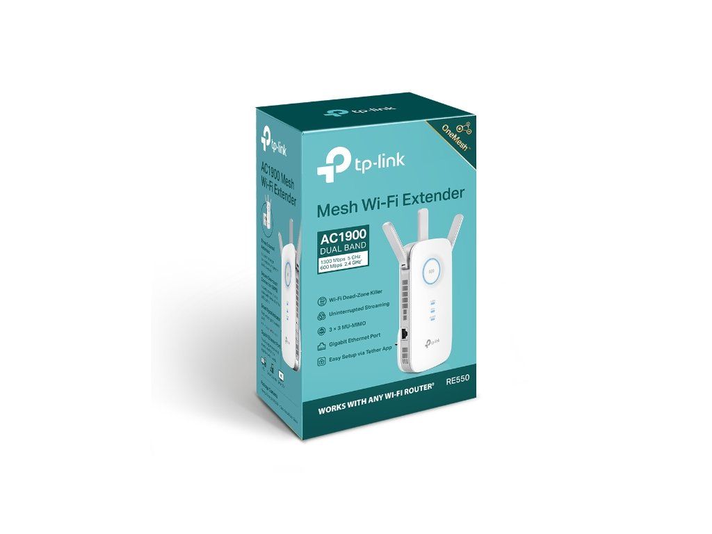 AC1900 Wi-Fi Range Extender, rýchlosti: 600 Mbps at 2.4 GHz + 1300 Mbps at 5 GHz, 3x Externá anténa, 1x Gigabit Port, Wall Plugged.Tether App, WPS, Intelligent Signal Light, Access Control, Power Schedule, LED Control, RE/AP Mode, OneMesh. Maximálna pokrytie - rozšírte dosah Wi-Fi siete až na 1 115 m2.