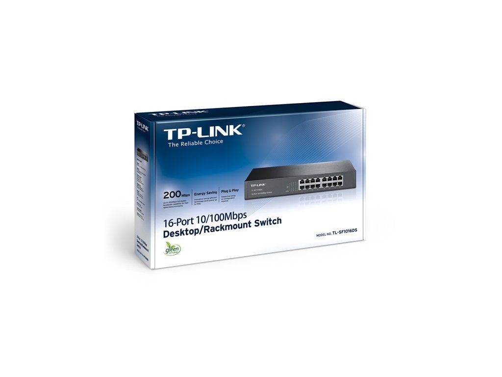 TP-Link TL-SF1016DS 16-Port 10/100Mbps Switch Green PŘEHLED/OVERVIEW * Inovativní technologie úspory energie ušetří až 25 % spotřeby * Podporuje řízení toku IEEE 802.3x pro plně duplexní režim a Backpressure pro poloduplexní režim * Neblokovaná přepínací architektura předává a filtruje pakety plnou kabelovou rychlostí pro zajištění maximální propustnosti * Přepínací kapacita 3,2 Gbit/s * Uložení a předání, schéma přepínání * Funkce Auto MDI/MDIX eliminuje potřebu křížených kabelů * Podporuje automatické učení adres MAC a Auto-aging * Funkce automatického vyjednávání portů zajišťuje inteligentní integraci mezi hardwarem 10 a 100 Mbit/s * Provedení typu Plug and Play usnadňuje instalaci * Provedení bez ventilátorů zajišťuje tichý provoz SPECIFIKACE/SPECIFICATIONS HARDWAROVé FUNKCE Standardy a protokoly * IEEE 802.3i, IEEE 802.3u, IEEE 802.3x Rozhraní * 16 10/100Mbps RJ45 Ports (Auto Negotiation/Auto MDI/MDIX) Síťová media * 10BASE-T: UTP category 3, 4, 5 cable (maximum 100m) * 100BASE-TX: UTP category 5, 5e or above cable (maximum 100m) Fan Quantity * Fanless Napájení * 100-240VAC, 50/60Hz Rozměry (š*h*v) * 294×180×44 mm Spotřeba * Maximum: 2.23W (220V/50Hz) * VÝKON Switching Capacity * 3.2Gbps Tabulka MAC adres * 8K Buffer Memory * 2Mb Rychlost předávání paketů * 2.38Mpps Green Technology * Innovative energy-efficient technology saves power up to 25% Transfer Method * Store-and-Forward JINÉ Certifikace * FCC, CE, RoHS Obsah balení * 16-Port 10/100Mbps Desktop/Rackmount Switch * Power Cord * Installation Guide * Rackmount Kit * Rubber Feet Systémové požadavky * Microsoft® Windows® 98SE, NT, 2000, XP, Vista™, Windows 7 or Windows 8, MAC® OS, NetWare®, UNIX® or Linux. Provozní prostředí * Operating Temperature: 0°,C~40°,C * Storage Temperature: -40°,C~70°,C * Operating Humidity: 10%~90% non-condensing * Storage Humidity: 5%~90% non-condensingDodatočné parametre