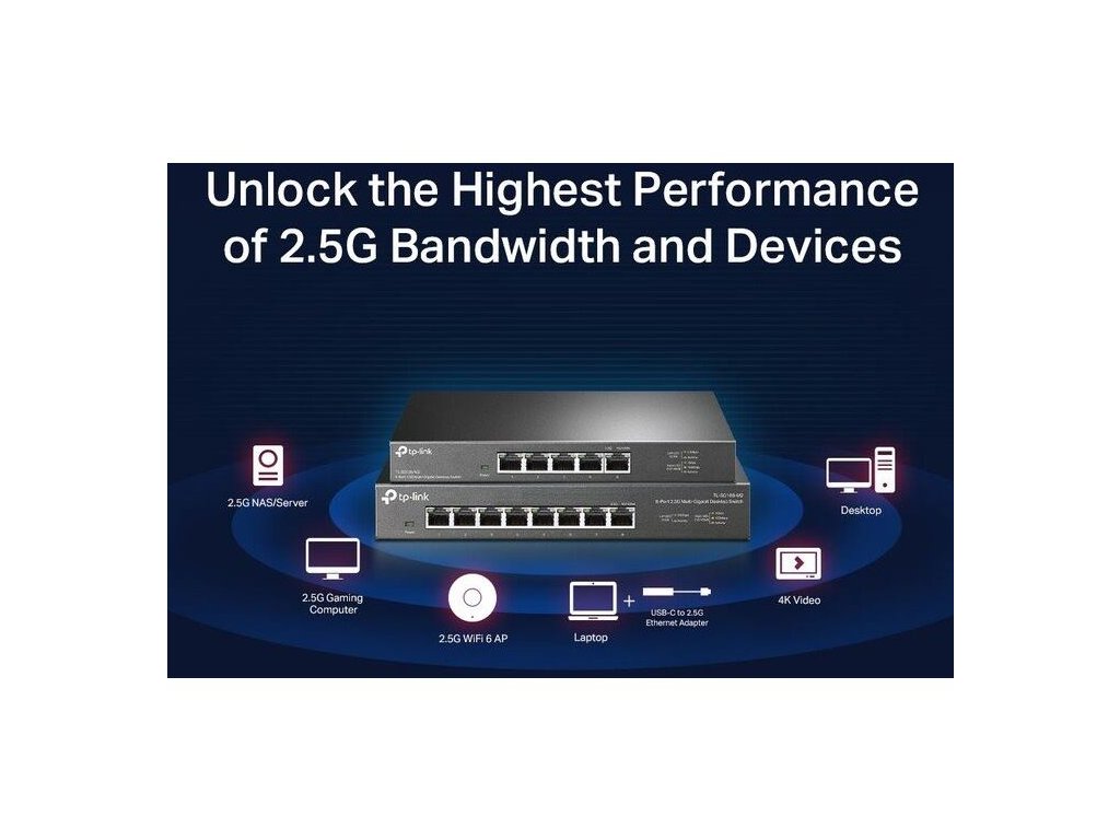 Stolný prepínač s vysokým výkonom (prepínacia kapacita až 40 Gbps), ktorý ponúka tichá prevádzka (bez ventilátora). Pokročilé technológie: 802.3x Flow Control a 802.1p / DSCP QoS. Rozhranie: 8x 100Mbps / 1Gbps / 2.5Gbp Ports, Auto-Negotiation, Auto-MDI / MDIX.