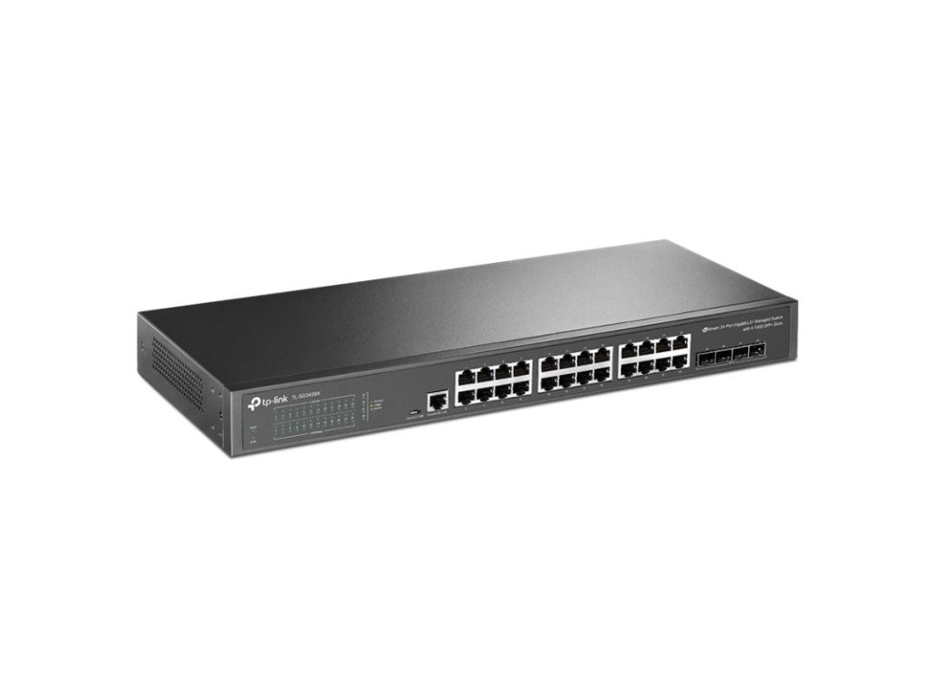 JetStream 24-Port Gigabit L2+ Managed Switch with 4 10GE SFP+ Slots, porty: 24× Gigabit RJ45 Ports, 4× 10G SFP+ Slots, RJ45/Micro-USB Console Port, špecifikácie: 1U 19-inch Rack-mountable Steel Case, vlastnosti: Integration with Omada SDN Controller, Static Routing, OAM, sFlow, DDM, 802.1Q VLAN, QinQ, STP/RSTP/MSTP, IGMP Snooping, 802.1p/DSCP QoS, ACL, 802.1x, Radius/Tacacs+ Authentication, LACP, CLI, SNMP, Dual Image/Configuration, IPv6