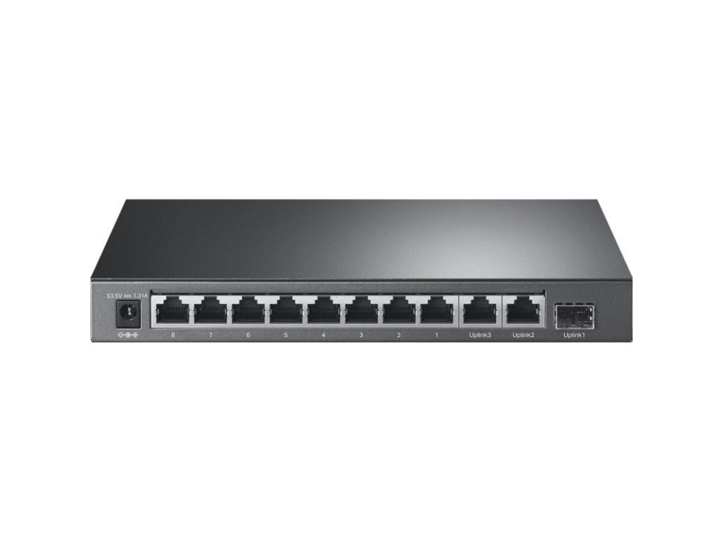 TL-SL1311P PoE+ Switch - 8-Port 10/100Mbps + 3-Port Gigabit Desktop Switch with 8-Port PoE+, 8× 10/100 Mbps PoE+ Ports, 2× Gigabit Non-PoE Ports, 1× Gigabit SFP Slots, špecifikácie: 802.3at/af, 65 W PoE Power, Desktop kovový obal, vlastnosti: Extend Mode for 250m PoE Transmitting, Isolation Mode, PoE Auto Recovery, Plug and Play
