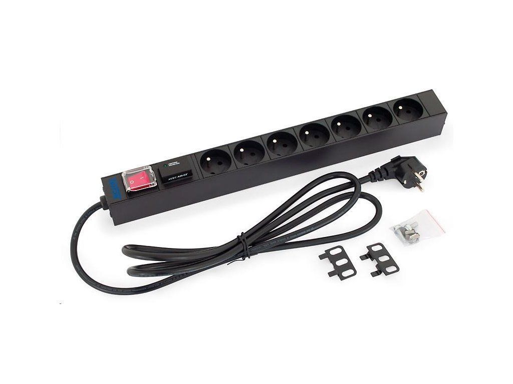 19" rozvádzač 1U; 7 x zásuvka podľa ČSN, max. 16 A; kábel 3 x 1,5 mm, 2 m + zástrčka univerzálna CZ-DE max. 16 A; bleskozvod; osvetlený spínač s bezpečnostným krytom; RAL 9005