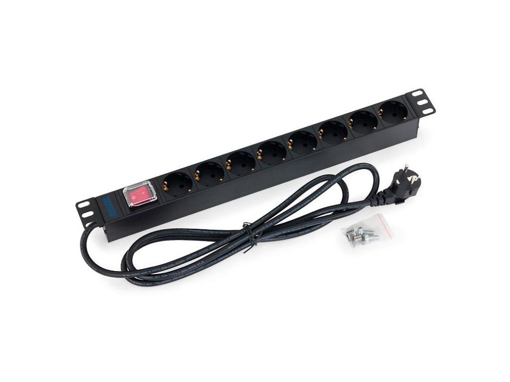 19 "rozvodný panel 1U; 8x zásuvka podľa DIN, max. 16 A; kábel 3 x 1,5 mm, 2 m + zástrčka univerzál CZ-DE, max. 16 A; podsvietený vypínač s bezpečnostným krytom; RAL 9005