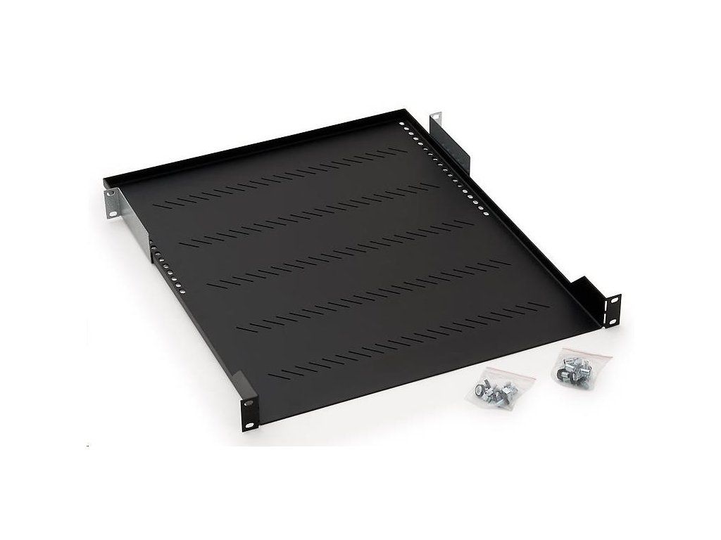 Polica s perforáciou 1U/450mm RAL 9005 čierna V porovnaní so štandardnou policou má tento typ nižšiu nosnosť, ale nezaberá 1U v skrini. Vďaka svojej konštrukcii umožňuje plné využitie inštalačných pozícií v skrini. Toto riešenie je obzvlášť výhodné pri tesných inštaláciách alebo v prípade nástenných rozvádzačov. Perforované telo police zabezpečuje prúdenie vzduchu. Police s hĺbkou 150 mm a 250 mm sa inštalujú len na predné vertikálne koľajnice. Zadné konzoly, ktoré sú súčasťou police od hĺbky 350 mm, zvyšujú nosnosť police po pripevnení k druhému páru zvislých koľajníc. Inštalačná súprava Nosnosť políc: 150 mm - 15 kg 250 mm - 20 kg 350 mm - 40 kg 450 mm - 40 kg 550 mm - 40 kg 650 mm - 40 kg 750 mm - 40 kg.Dodatočné parametre