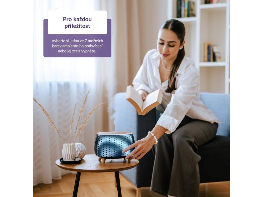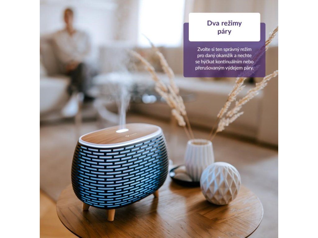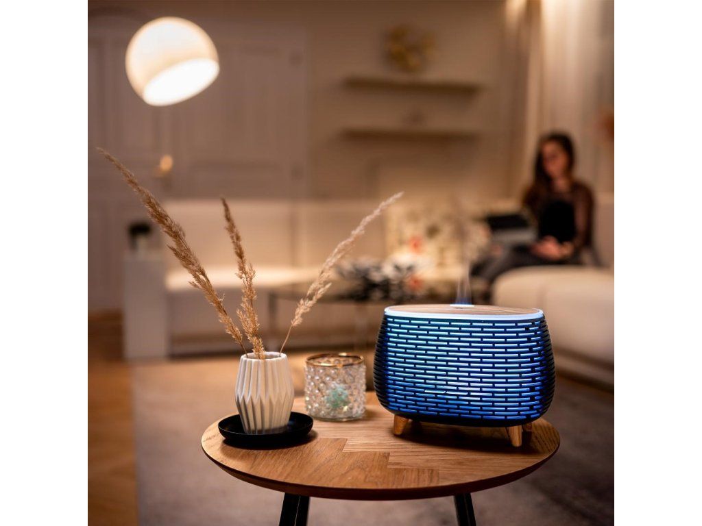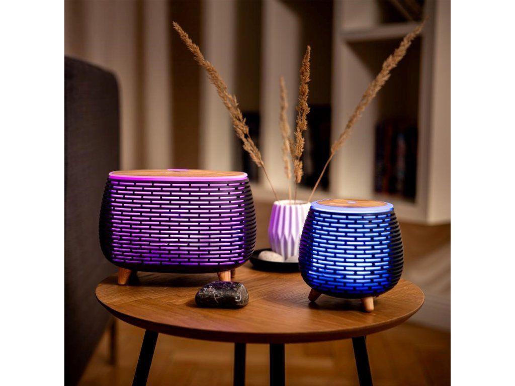 Terapia vôňou aj farbami vás uvoľní, upokojí alebo napríklad naopak naštartuje vašu produktivitu. Nádržku s objemom 400 ml stačí naplniť vodou na zvlhčenie vzduchu alebo pridať niekoľko kvapiek esenciálneho oleja a užívať si aromaterapeutické účinky. Ambientné osvetlenie ponúka 7 farieb nastaviteľných v rôznych režimoch, od statických farieb po plynulé prechody medzi všetkými farbami. Dokonale tak vyladíte atmosféru podľa svojich potrieb.